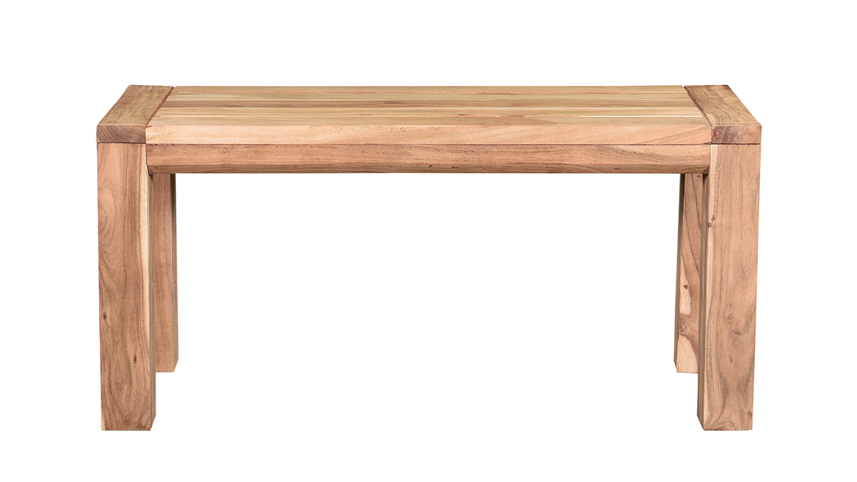 Ce banc d'intérieur met à l'honneur l'acacia massif avec splendeur. Essence de bois exotique aux reflets dorés, il laisse apparaître ici ses nervures et ses noeuds tout en beauté. Cette matière naturelle est mise en valeur par un design brut, venant souliger le caractère authentique de ce banc. Plébiscitée pour la confection de mobilier d'intérieur, l'acacia est une essence naturellement dure et dense particulièrement esthétique. Ce bois imputrescible, se distingue par ses veinures allongées, mais également ses variations de couleurs. Avec le temps, l'exposition à la lumière et sources de chaleur, l'acacia est un bois clair dont le coloris jaune-vert à doré subit une coloration naturelle (brune, rougeoyante, reflets gris). Ce meuble en bois d'acacia est traité avec une finition laque incolore.