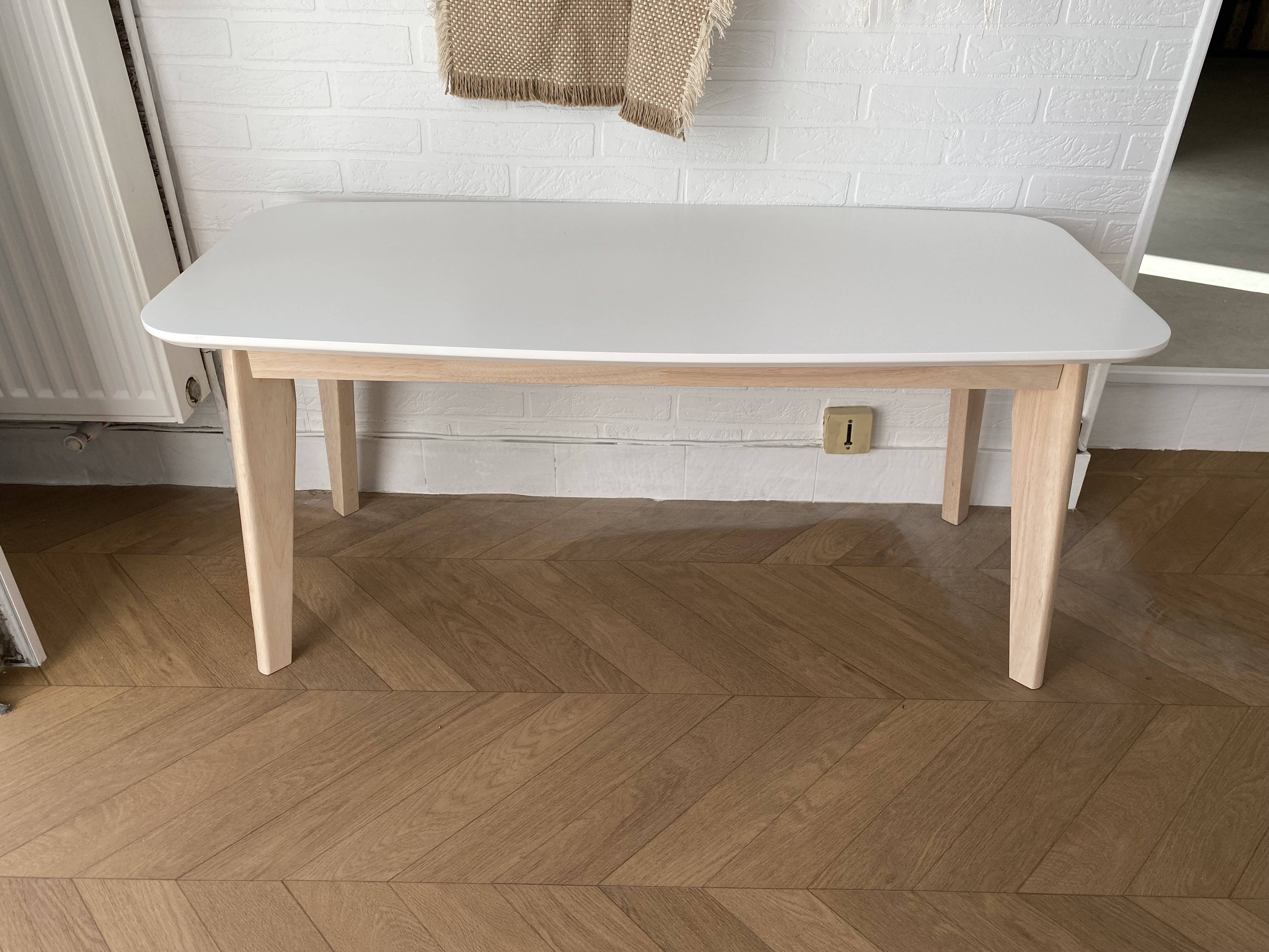 Ses pieds en bois d'hévéa massif, un élégant et robuste bois clair, se marient à merveille au plateau laqué en blanc mat.