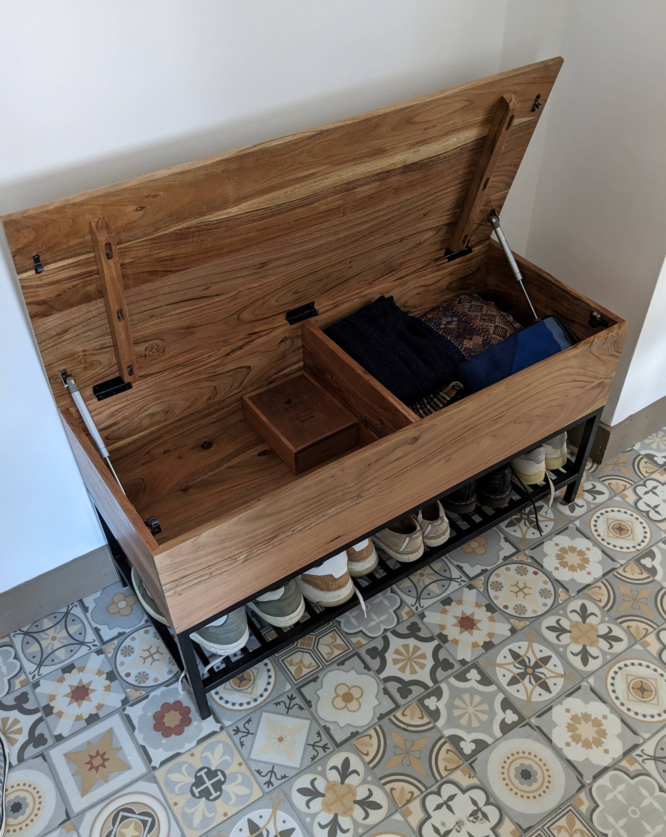 Astuce déco : en complément du banc d'entrée SORG, délimitez l'espace et créer une ambiance chaleureuse avec un joli tapis.