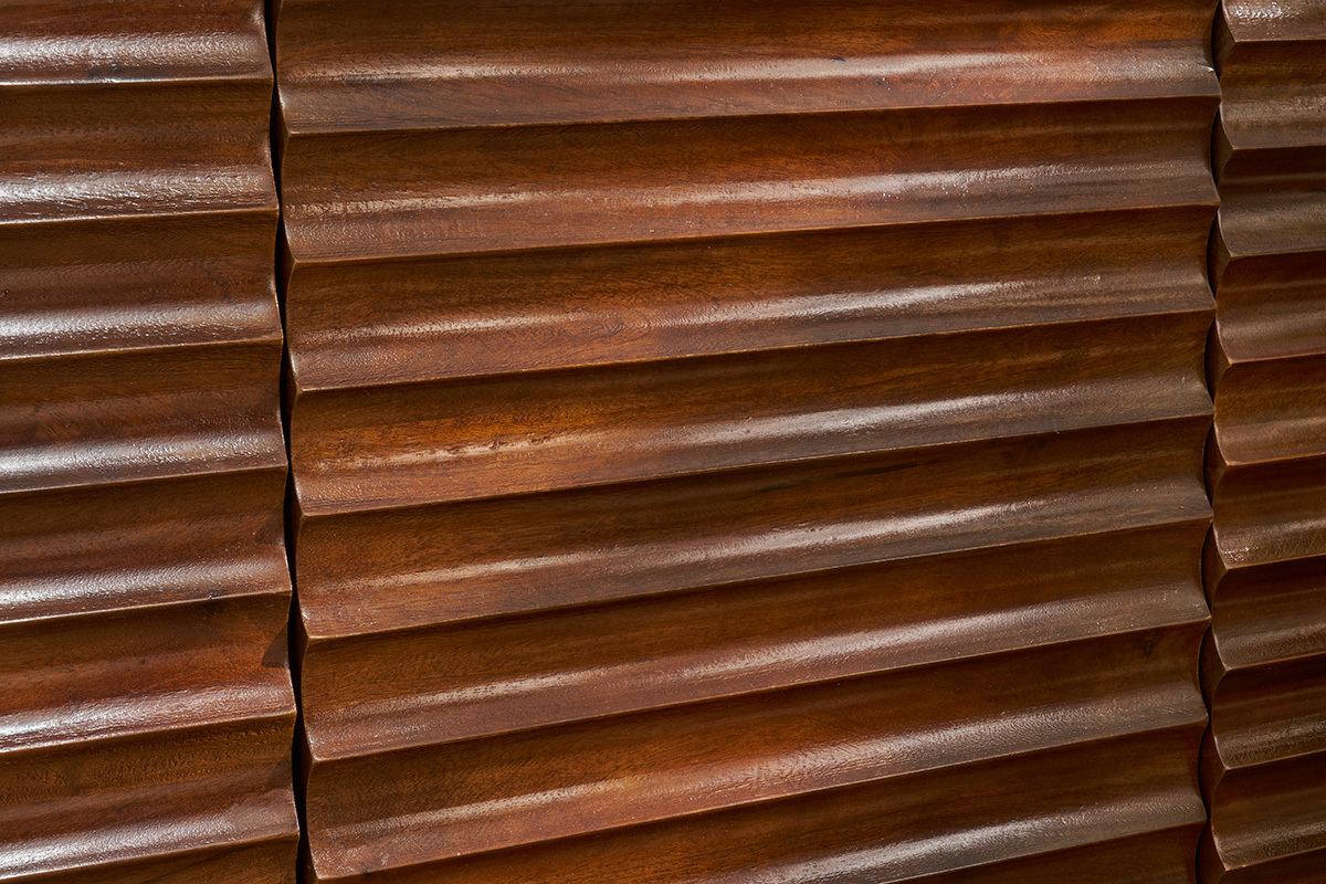 Ce buffet design à la silhouette affirmée est issu d'un superbe travail sur la matière. Réalisé en manguier massif, il se distingue par sa façade qui semble creusée par des sillons. Ce bois chaleureux et exotique a été travaillé de façon artisanale faisant de chaque buffet une pièce unique. La patine marron foncé appliquée sur ce buffet en bois nourrit la matière tout en renforçant un peu plus son caractère authentique.
