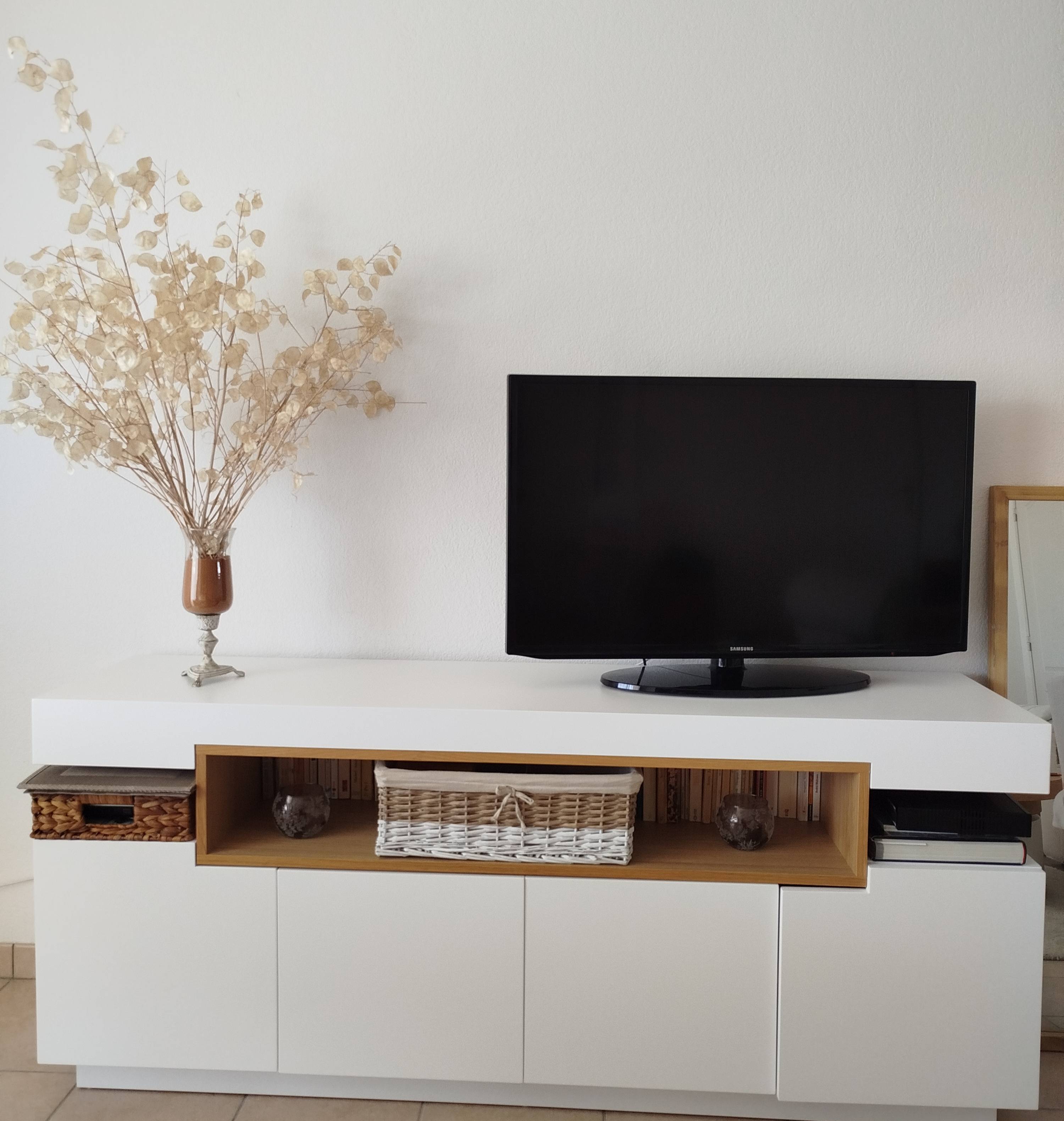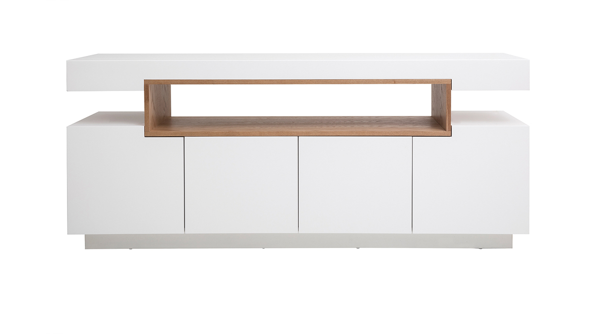 Le buffet LIVO n'offre pas deux, ni trois, mais quatre portes de placard afin de ranger et de structurer le maximum l'intérieur. Pour réchauffer une base blanche, j'ai ajouté une grande niche placage bois chaleureuse dans laquelle peuvent se ranger livres et multiples objets de décoration.