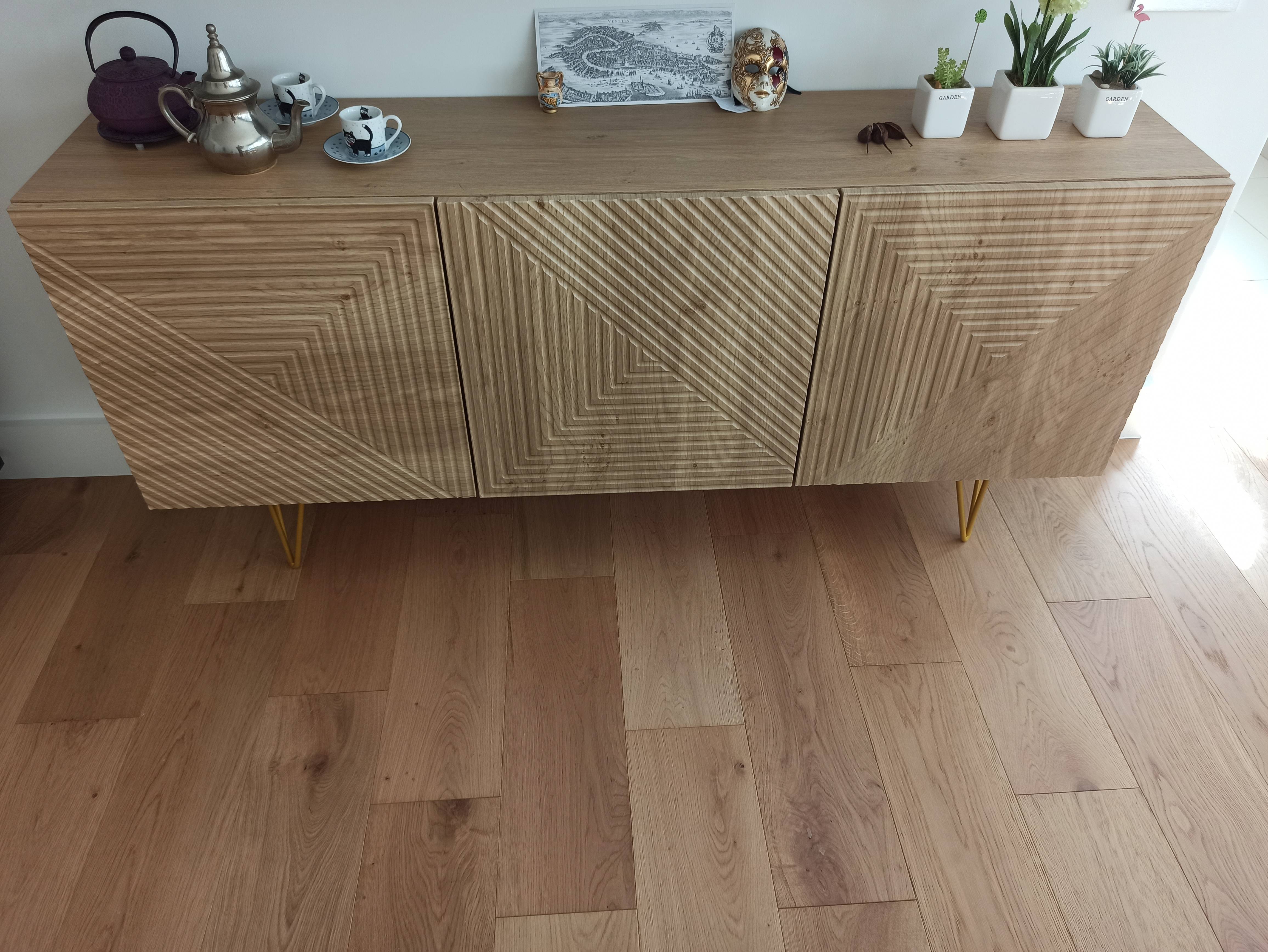 Avec le buffet OZEN, les intérieurs contemporains ont trouvé leur perle rare ! Petit bijou de design, ce buffet moderne se démarque par son originalité. Les trois portes sont ornées d'un magnifique motif géométrique en relief ton sur ton. Atypique mais discret, il fait toute l'élégance de ce meuble de rangement en enfilade. La finition bois clair de la structure est réhaussé par un piètement épingle en métal doré. Ce détail chic et coloré est travaillé avec finesse pour un style tout en légèreté.