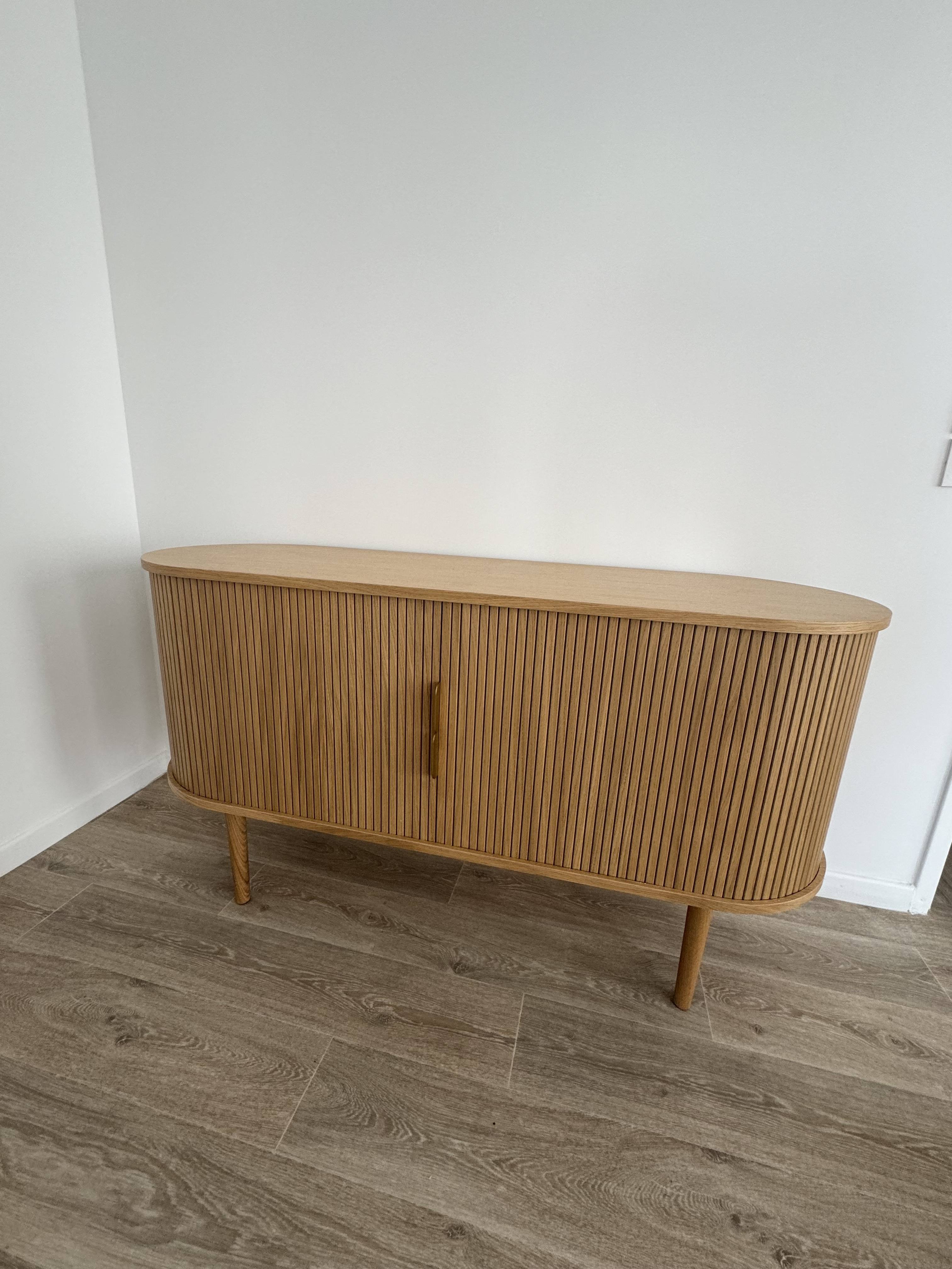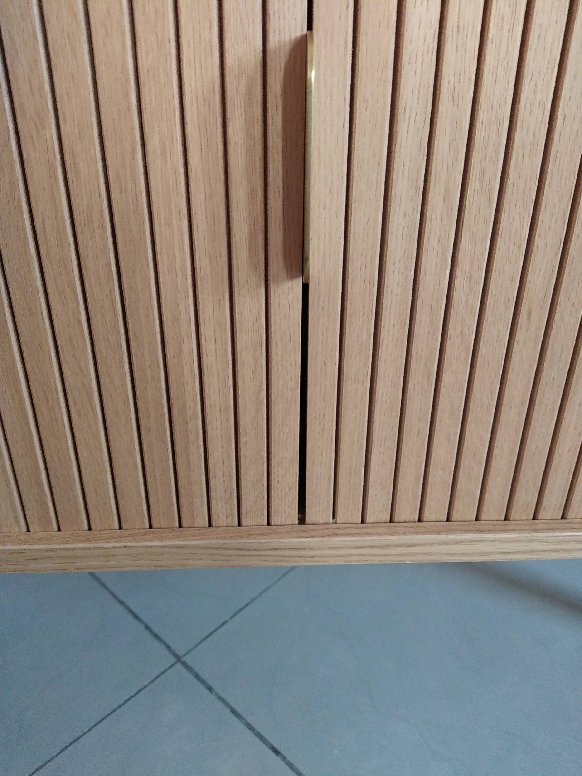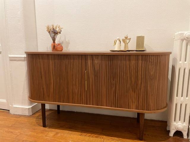 Forme oblongue, pieds hauts et légèrement fuselés, portes rideaux coulissantes en lattes de bois, détail minimaliste des poignées dorées... Question esthétique, ce buffet design n'a rien à envier aux plus grands !