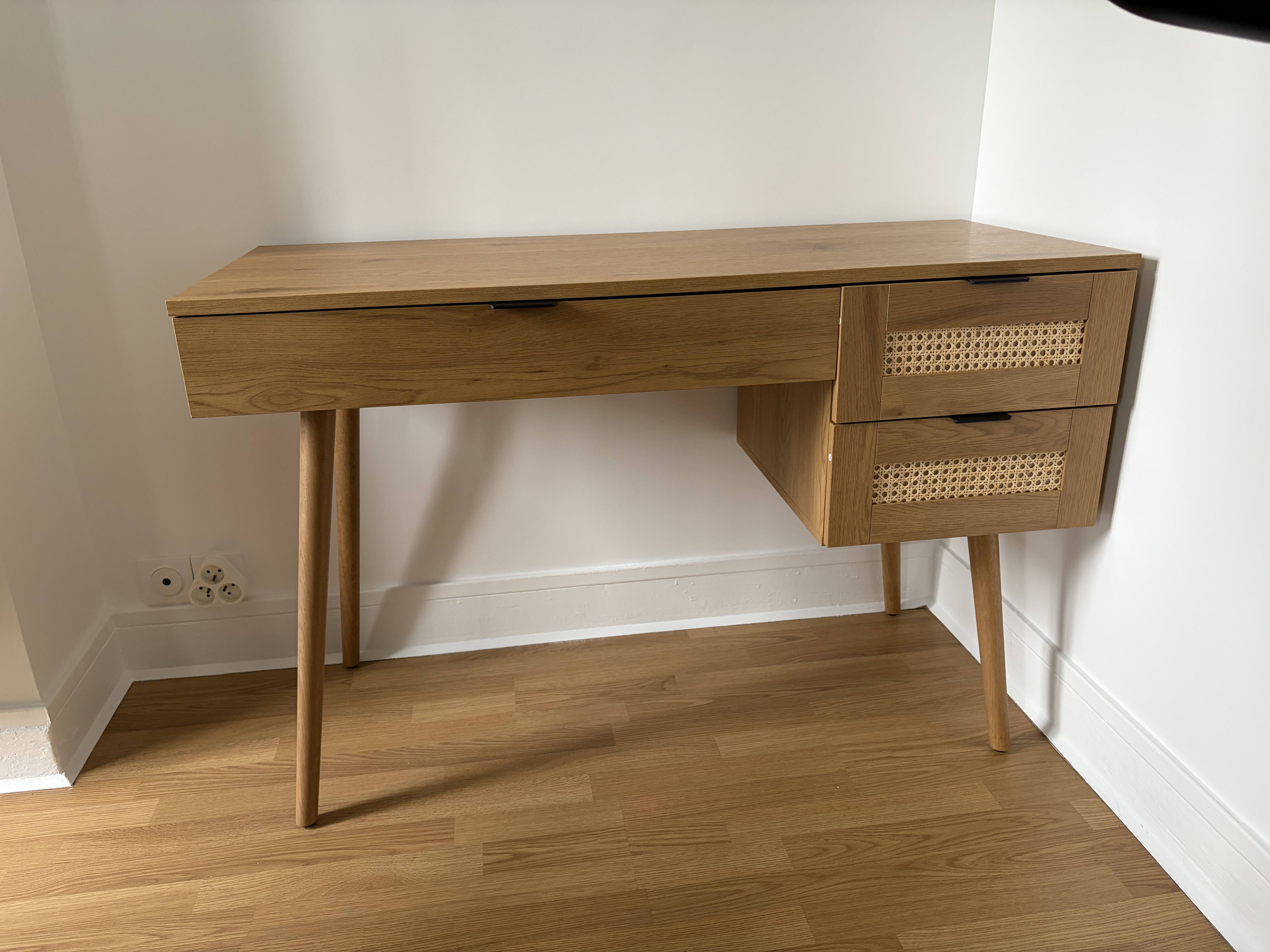Ce bureau en bois se distingue par ses trois tiroirs spacieux, dont deux ornés de cannage en rotin, apportant une touche d'authenticité et d'originalité à la pièce. Le cannage en rotin naturel, à la fois tendance et intemporel, confère à ce bureau une allure unique tout en offrant une solution pratique de rangement. Ces tiroirs permettent de ranger facilement vos fournitures, documents ou tout autre objet du quotidien, assurant ainsi un espace de travail organisé et fonctionnel.