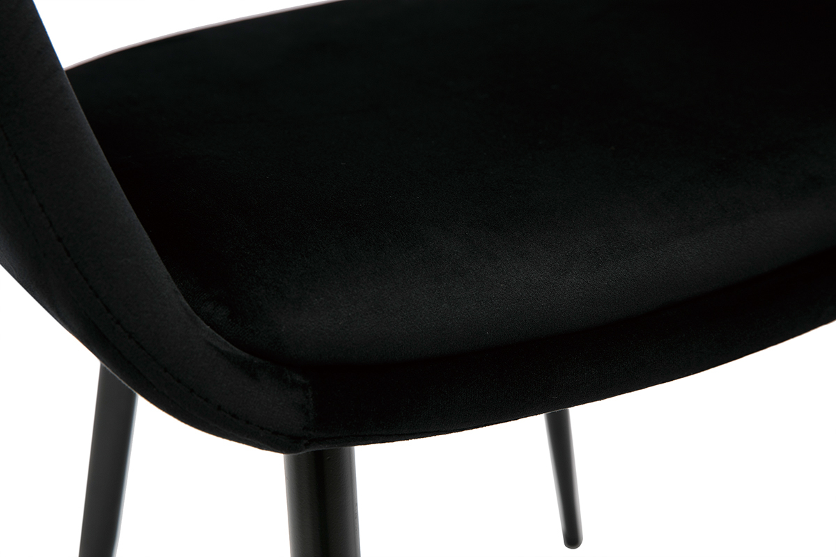 Cette chaise maîtrise avec justesse courbes vintage et design tendance. Le siège tout en rondeur s'habille d'un velours noir, une matière douce et chaleureuse plébiscitée des intérieurs raffinés et cosy. Un clin d'oeil glamour modernisé par le piètement fuselé noir et l'originalité du dossier ajouré. Avec son look monochrome, on l'imagine parfaitement dans une pièce de vie à la déco rétro chic.