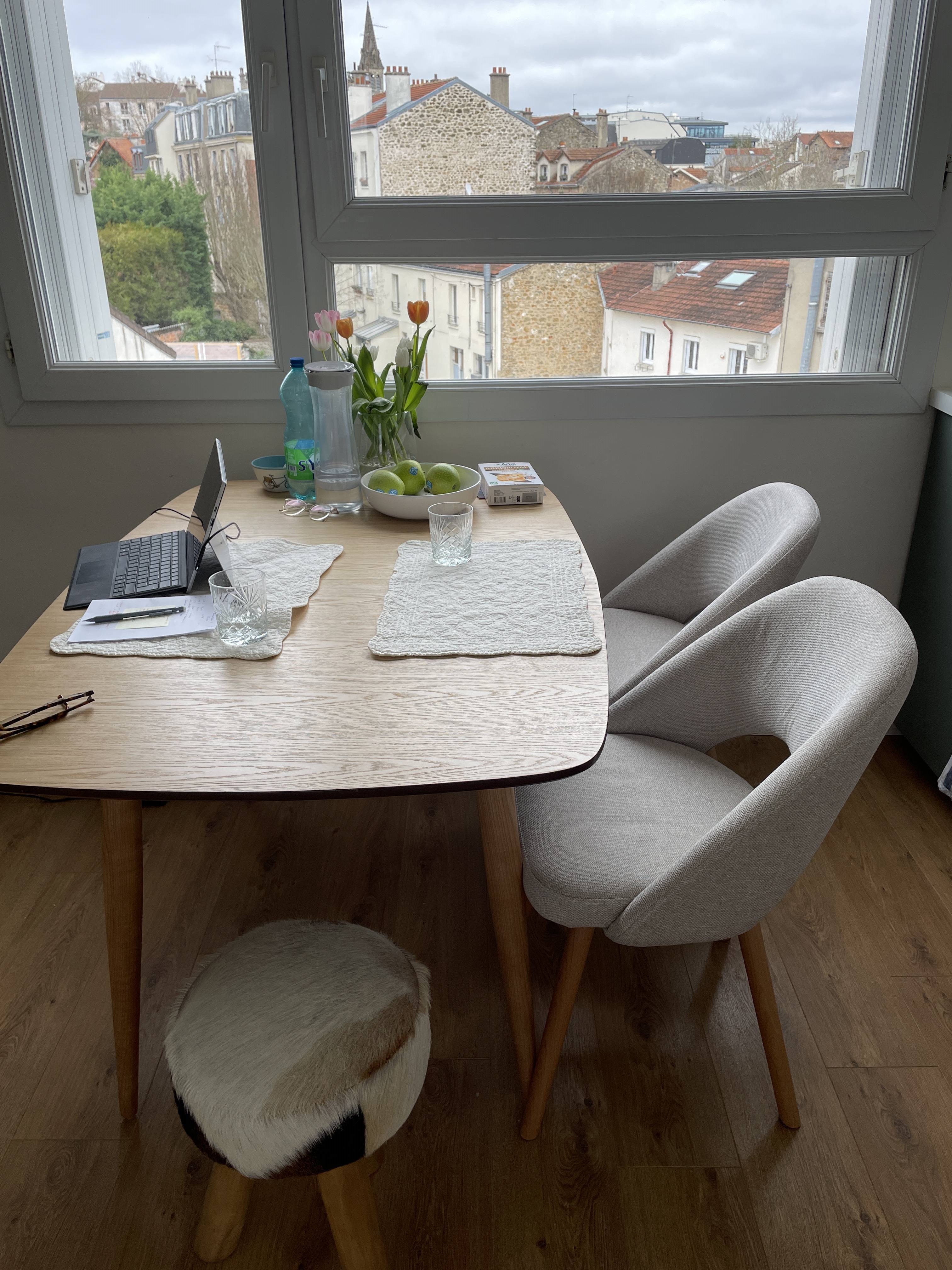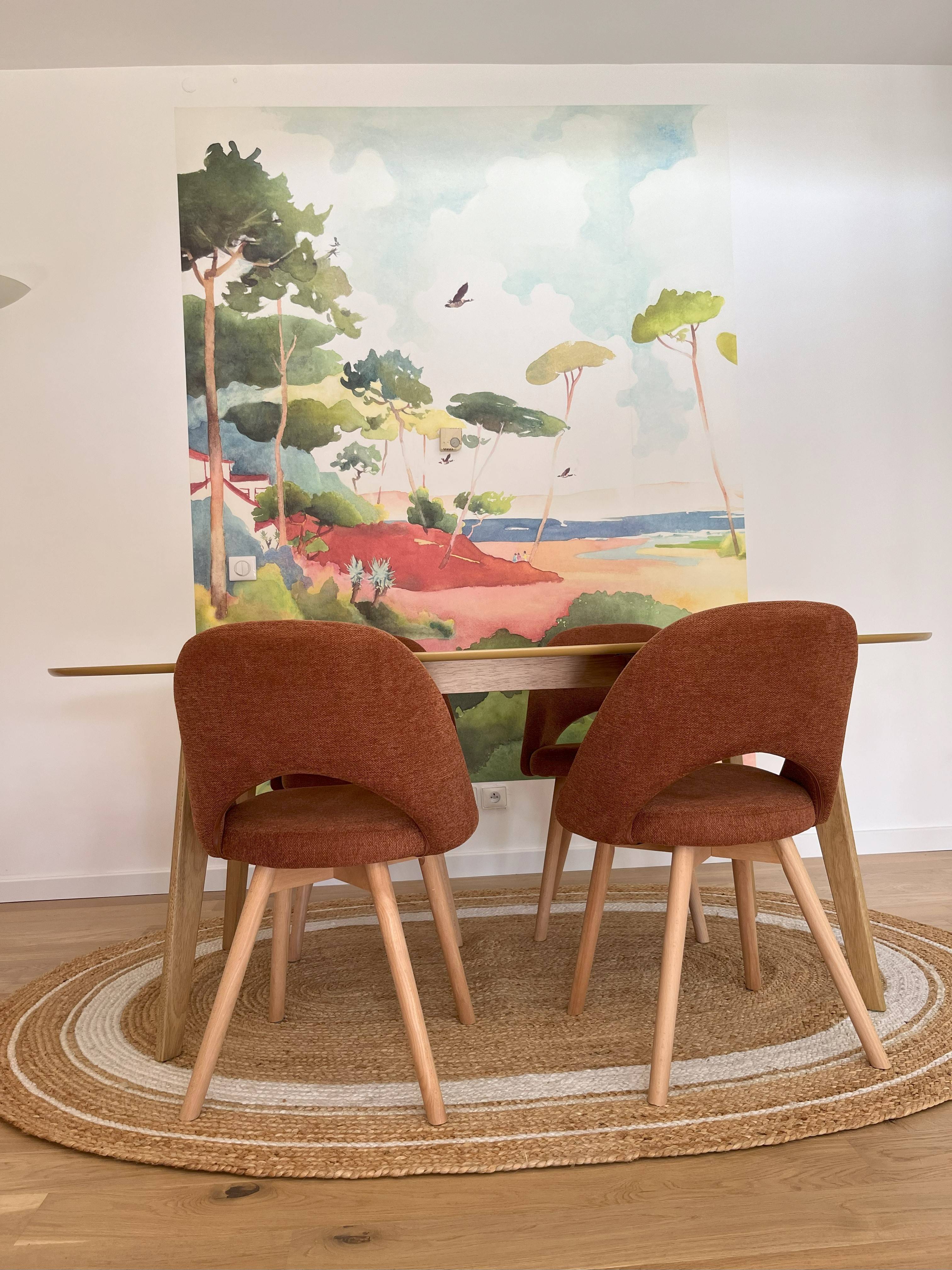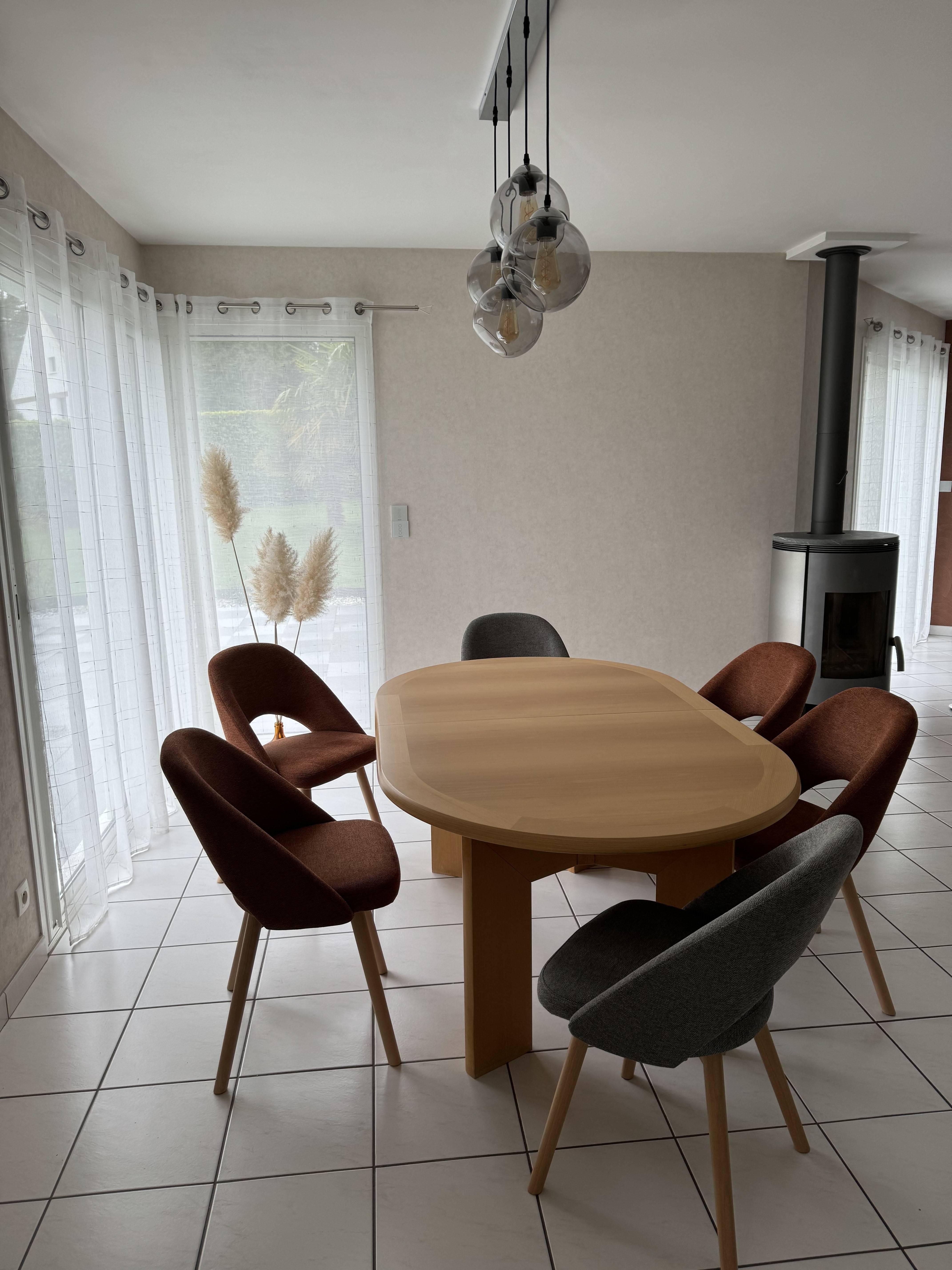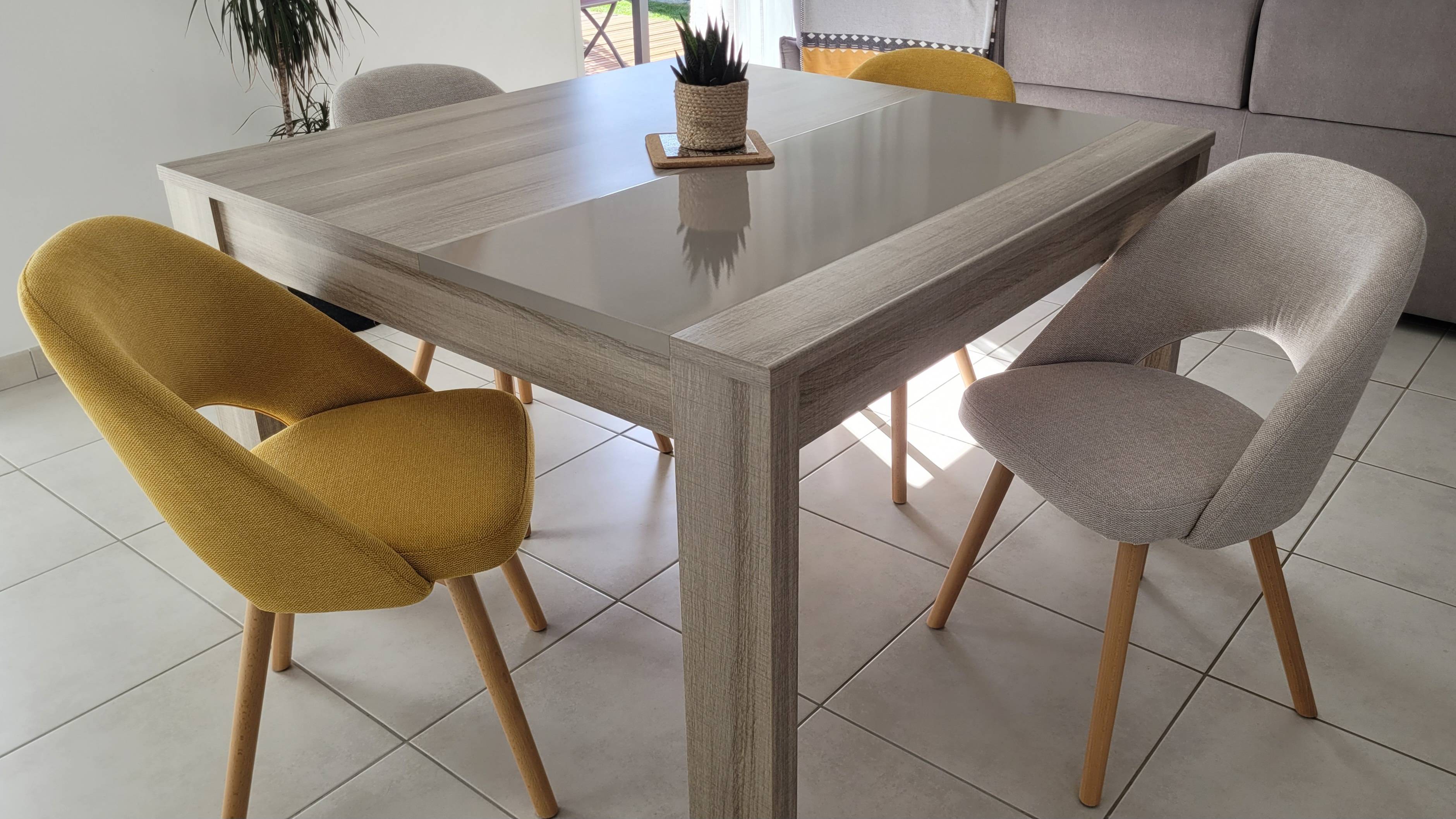Ces chaises jaune moutarde se multiplient à l'envi autour de la table à manger.