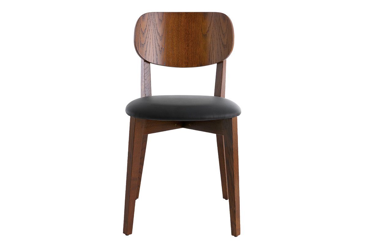 Les chaises LUCIA s'inscrivent dans la lignée du design scandinave des années 50. Loin des effets de mode, ces chaises s'intègrent durablement dans nos intérieurs. Le dossier en contreplaqué courbé et l'assise rembourrée (densité de la mousse 35 Kg/m3) offrent un excellent confort. Le joli revêtement noir (100% polyuréthane) qui habille l'assise s'accorde à merveille avec la finition noyer.
