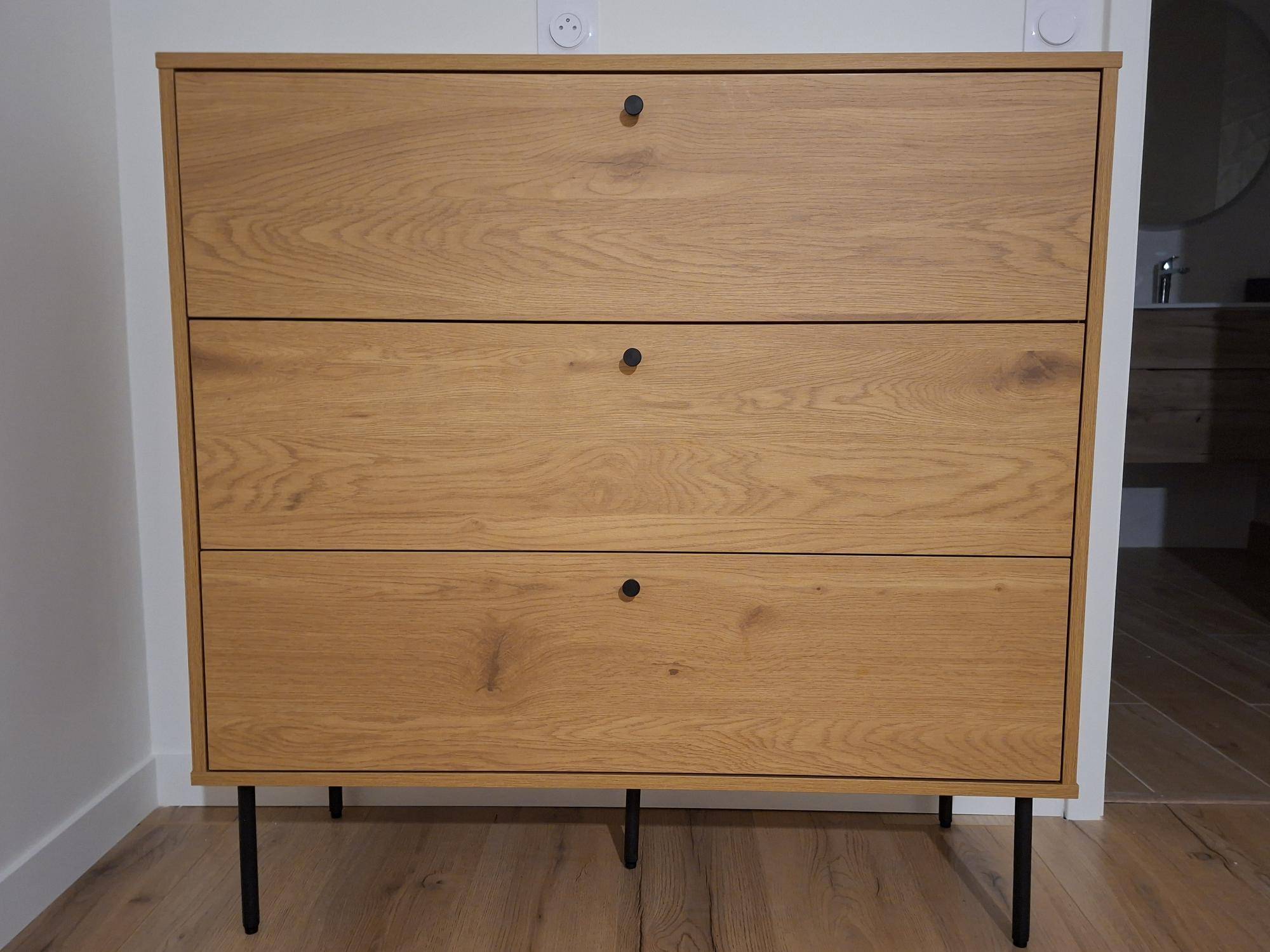 Cette commode à tiroirs - à la fois compacte et équipée de larges rangement - est l'alliée des petites chambres en quête de modernité. Elle pourra également habiller une entrée ou un couloir tout en longueur. Ses trois tiroirs (dimensions intérieures L92 x P33.5 x H18 cm) sont assez grands pour accueillir vos vêtements, votre linge de maison, des accessoires de mode ou des documents en fonction de son utilité.