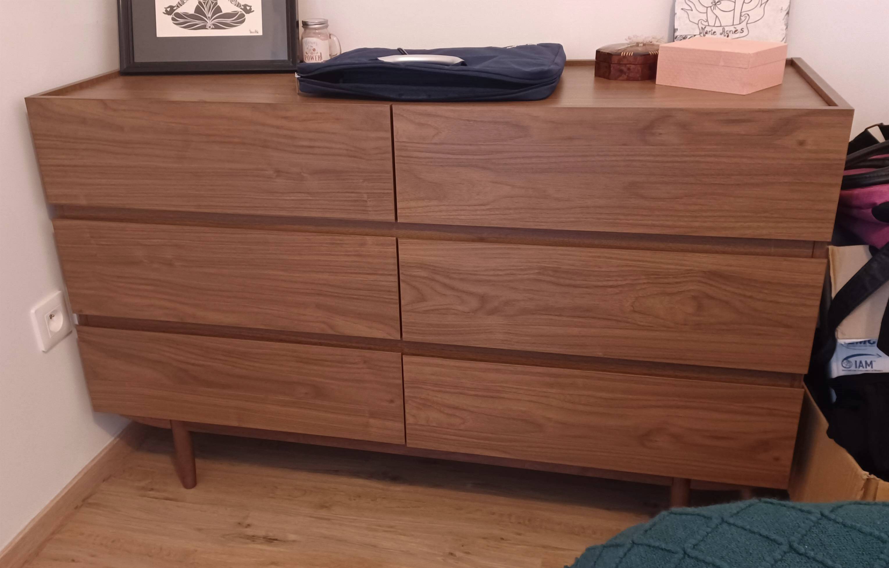 Commode finition bois foncé noyer 6 tiroirs L120 cm SANAA livrée prête à assembler.