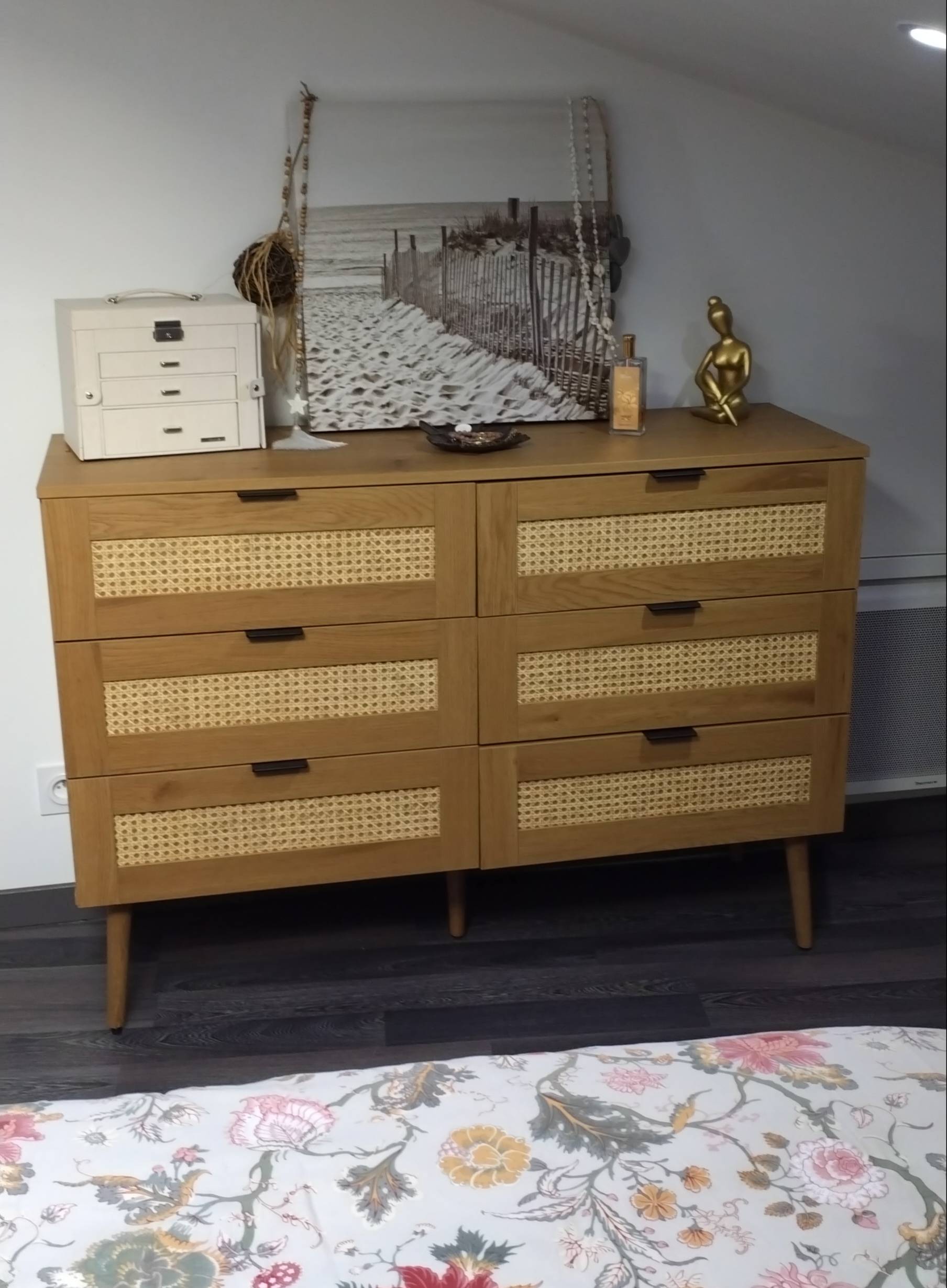Ce meuble de rangement se distingue par ses six tiroirs spacieux, offrant un grand espace d'organisation pour vos vêtements, linge de maison ou accessoires. La structure en panneaux de particules de bois mélaminé finition chaine qui définit cette commode s'accorde parfaitement avec les motifs délicats du cannage en rotin, créant un jeu de textures harmonieux. Ses poignées en métal noir discrètes et ses pieds effilés en chêne massif renforcent son allure épurée et moderne.