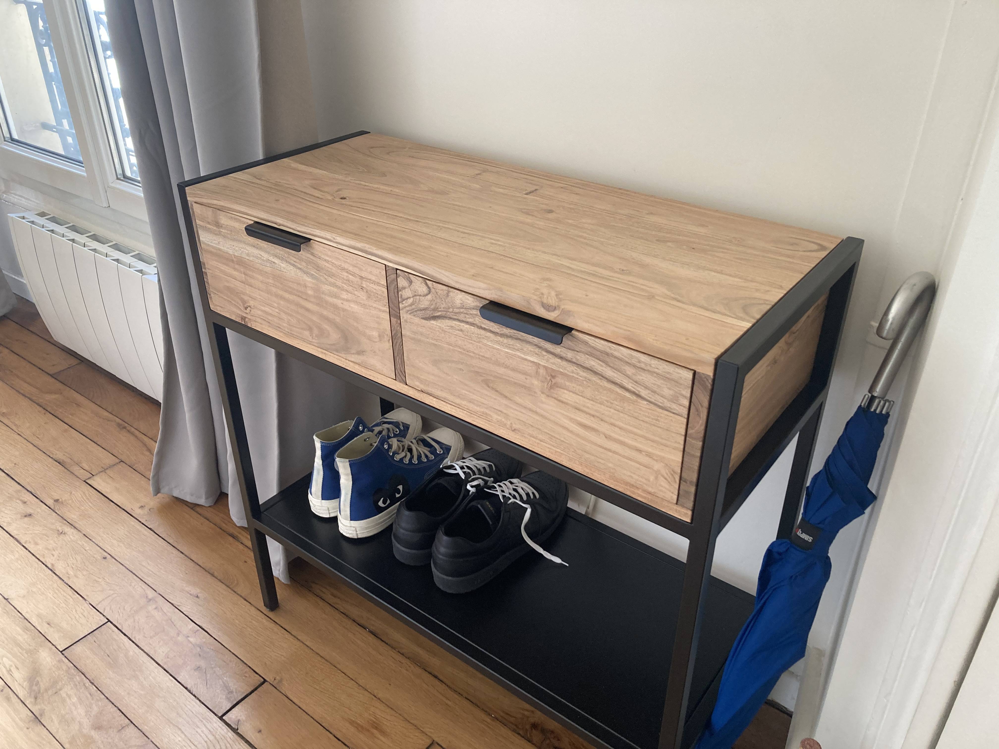 La particularité de la collection ARTHUS, c'est que chaque meuble possède une étagère basse en métal noir qui vient soutenir un élément de rangement en acacia massif. J'ai choisi de réutiliser pour les poignées la même matière que la structure pour donner de la cohérence et de l'harmonie à ce meuble.