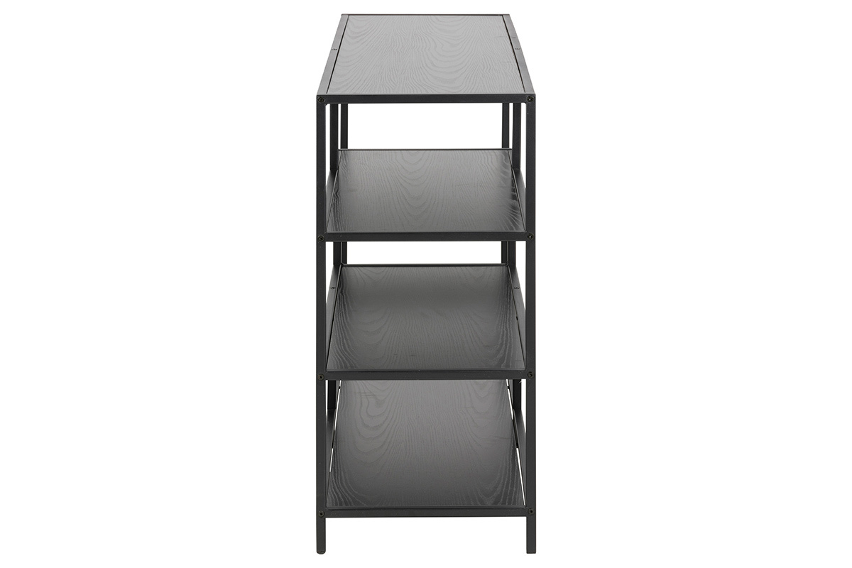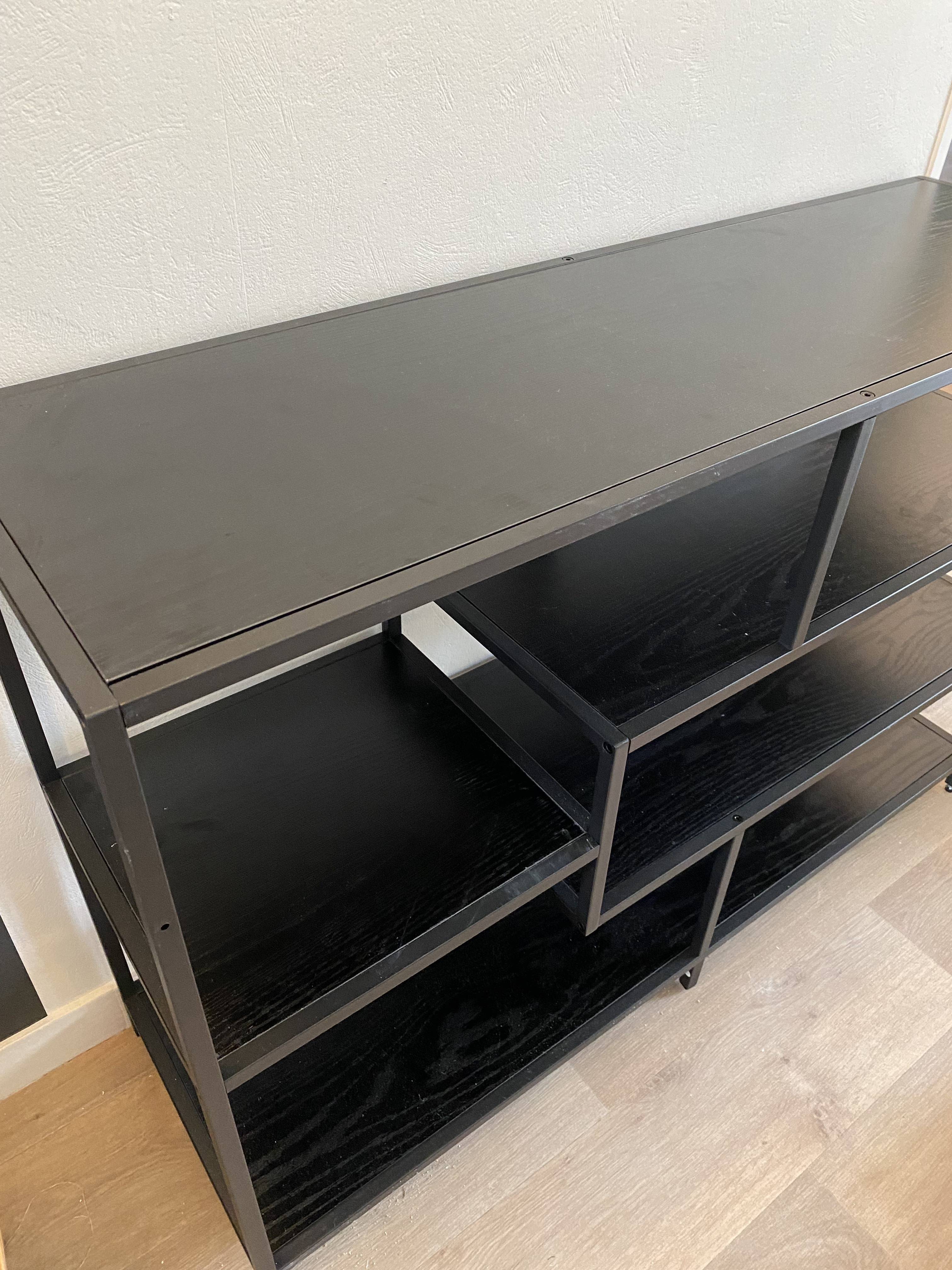 C'est la forme destructurée de cette console ouverte noire qui fait son charme. Sa structure en métal dessine des niches de rangement de tailles et hauteurs différentes offrant un rendu graphique et original. L'ensemble est complété par des étagères en panneaux de fibres de bois teintés noir pour un effet bimatière chaleureux et tendance. Avec son total look monochrome, cette console noire en bois et métal est un intemporel, facile à intégrer chez soi.