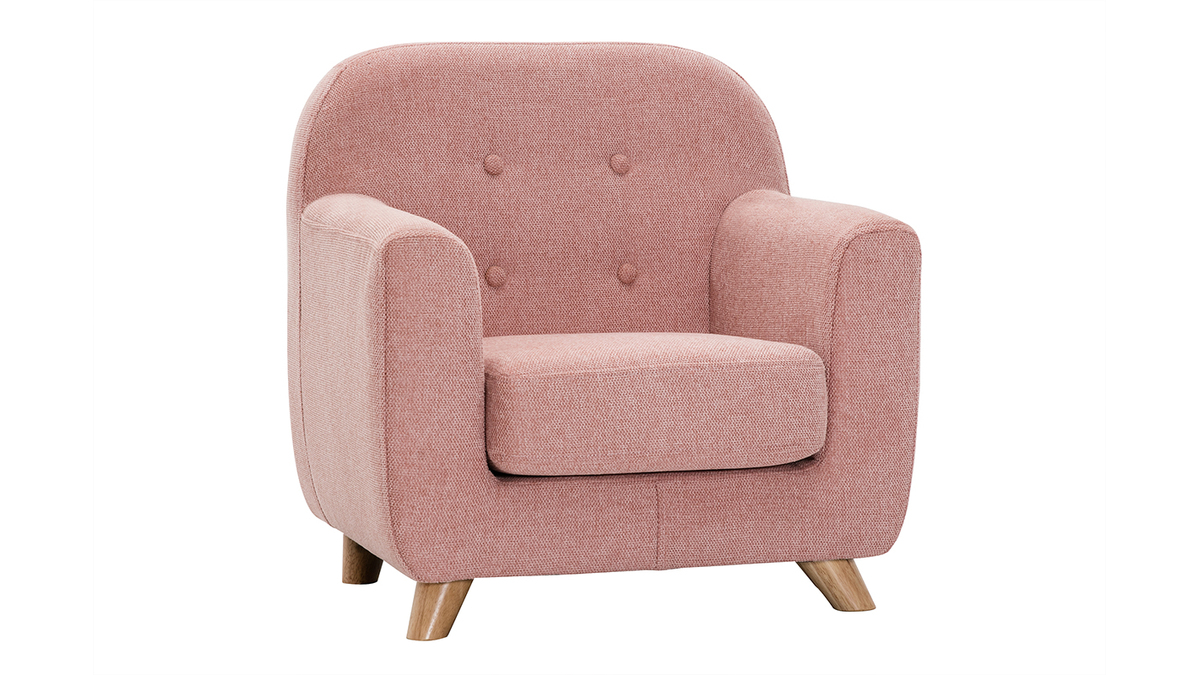 Fauteuil enfant scandinave en tissu effet velours texturé rose et bois clair NORKID livré prêt à assembler. Montage simple, seuls les pieds sont à fixer.