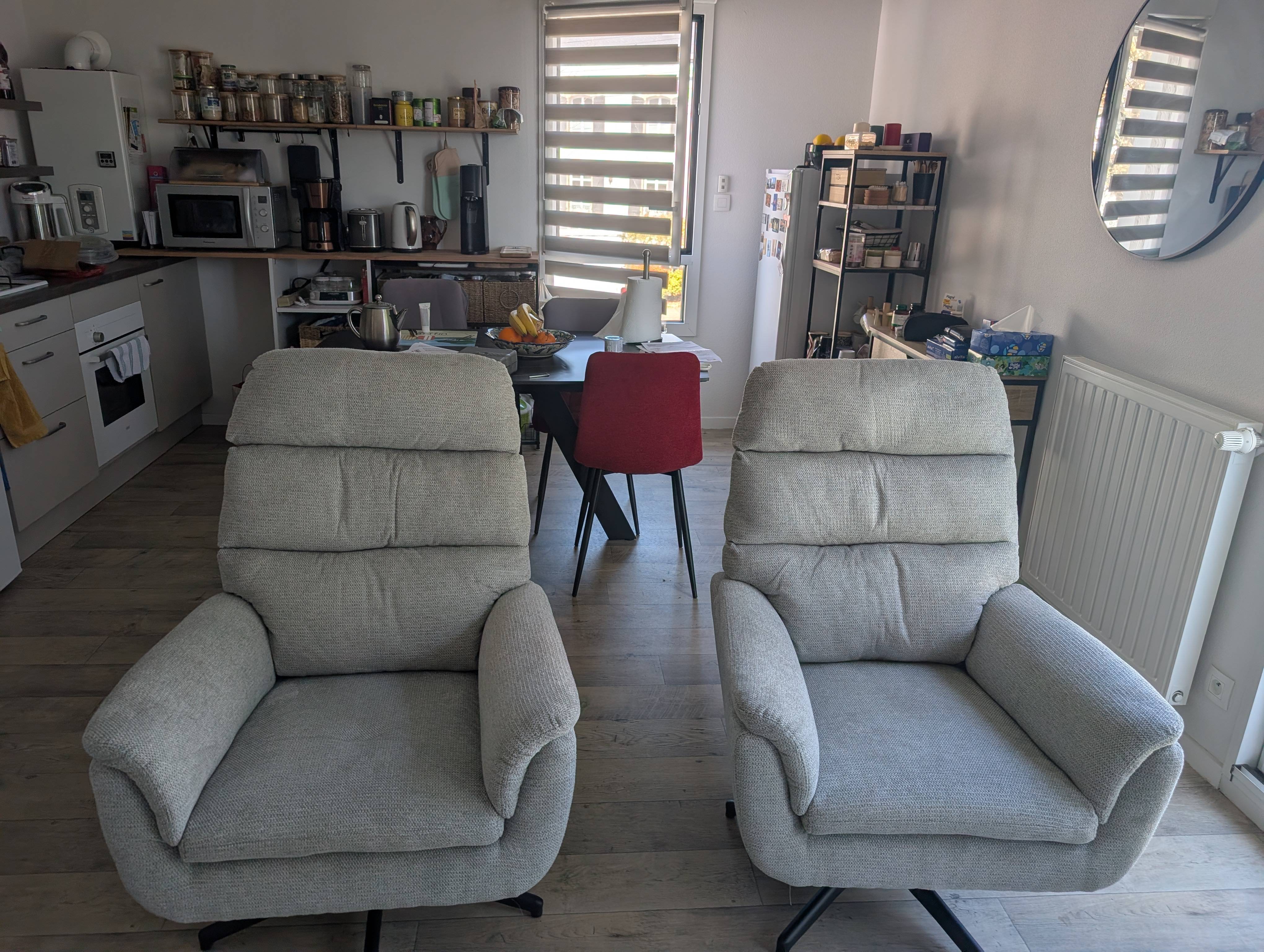 Ce fauteuil gris clair repose sur une base pivotante à 360°, réalisée en métal noir mat, assurant robustesse et stabilité tout en permettant une rotation fluide. Ce détail fonctionnel le rend idéal pour un coin lecture, un espace de détente ou même un bureau, où il s'adapte aisément aux mouvements et aux besoins de son utilisateur.