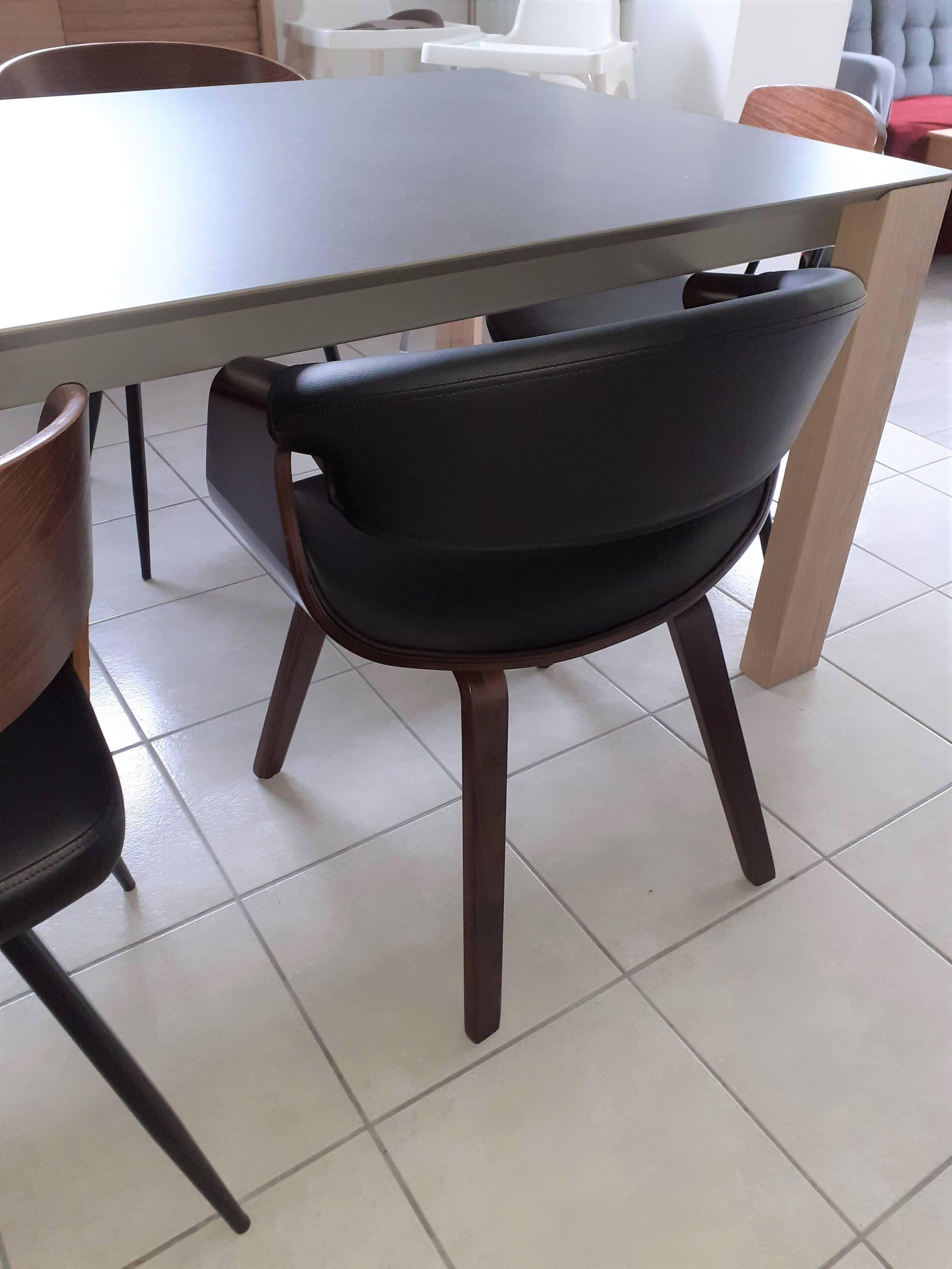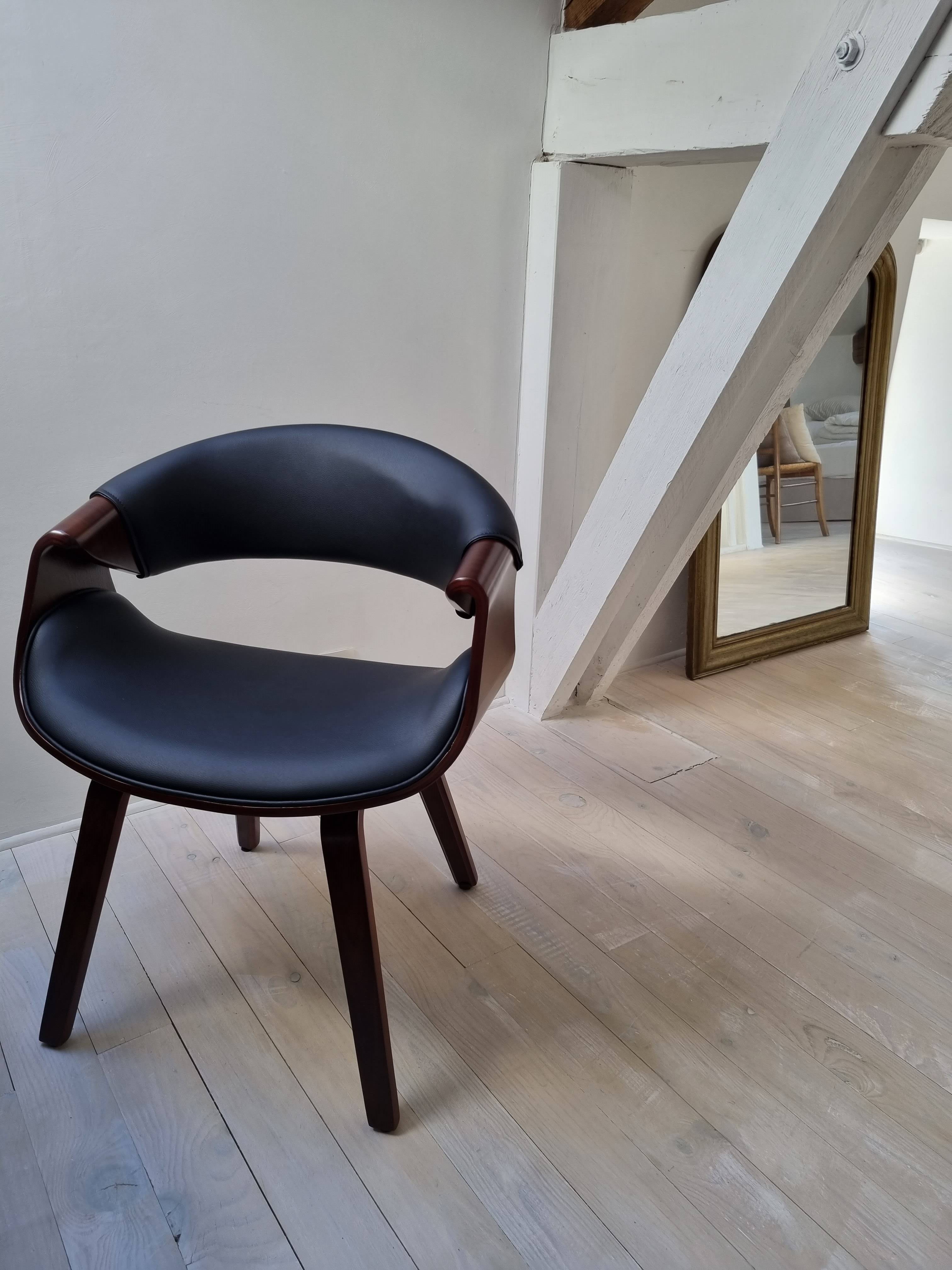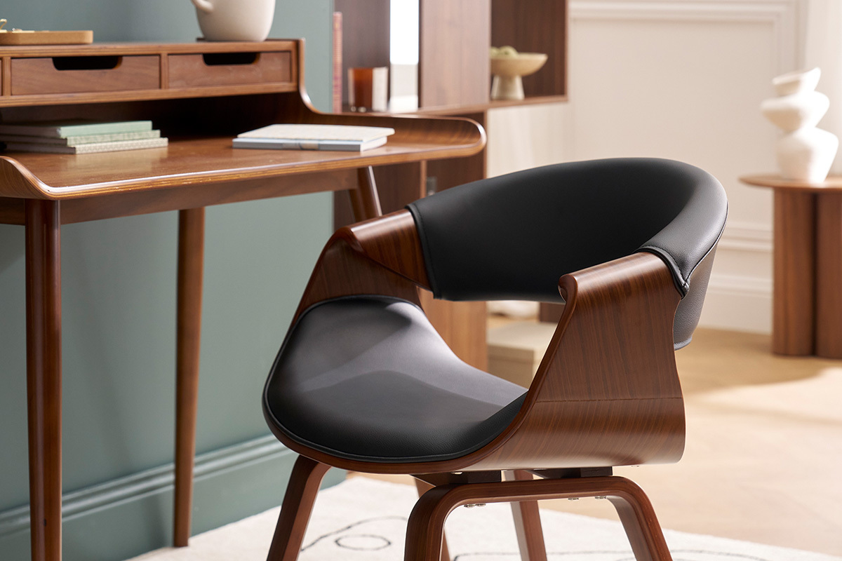 Une chaise avec accoudoirs, au faux-airs de fauteuil moderne et cosy ! Assise et dossier sont rembourrés et recouverts de polyuréthane noir, une finition facile à entretenir, qui apporte une touche chic à l'ensemble. Le piètement plaqué bois foncé, épais et robuste est quant à lui un véritable gage de robustesse et de stabilité.