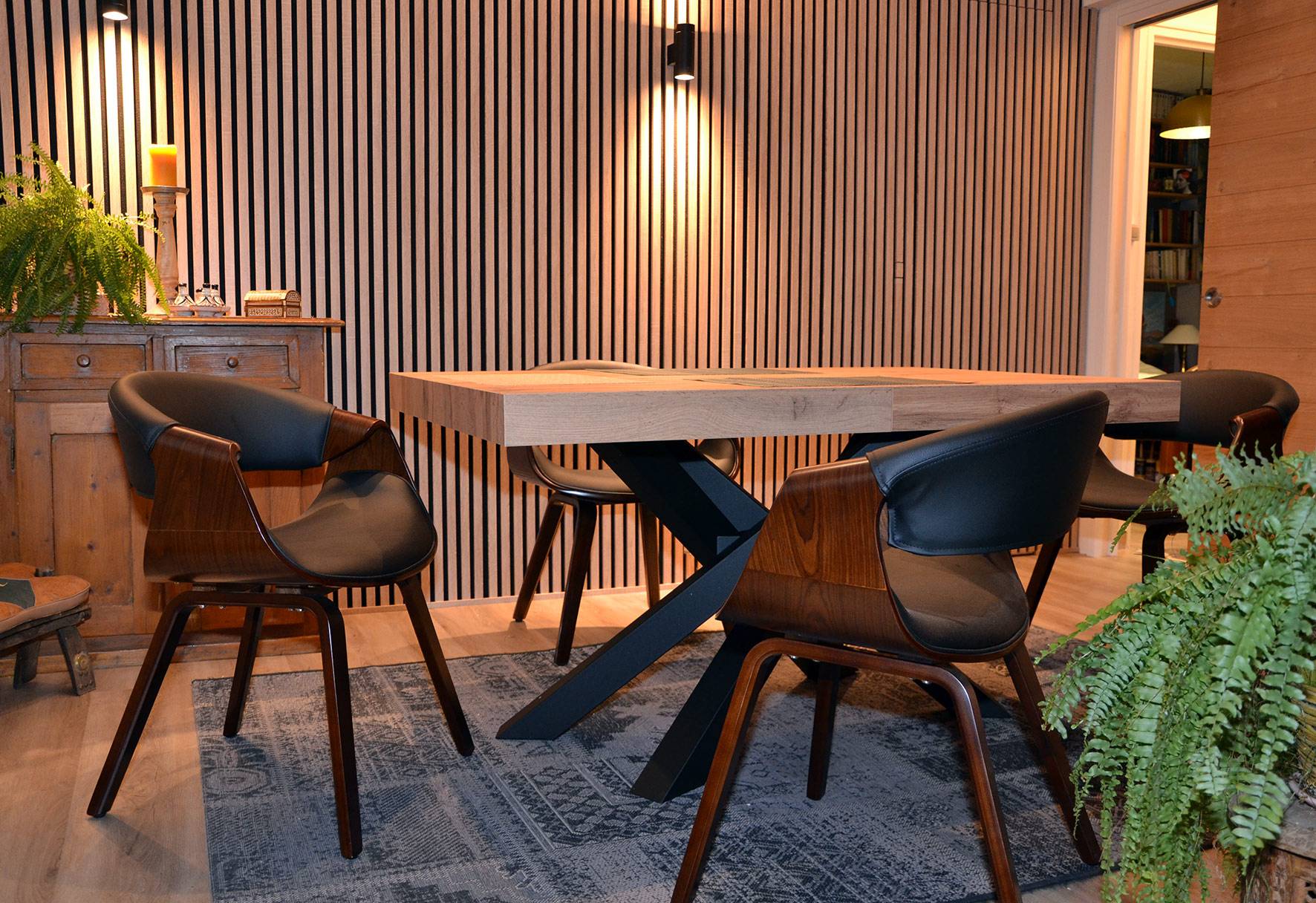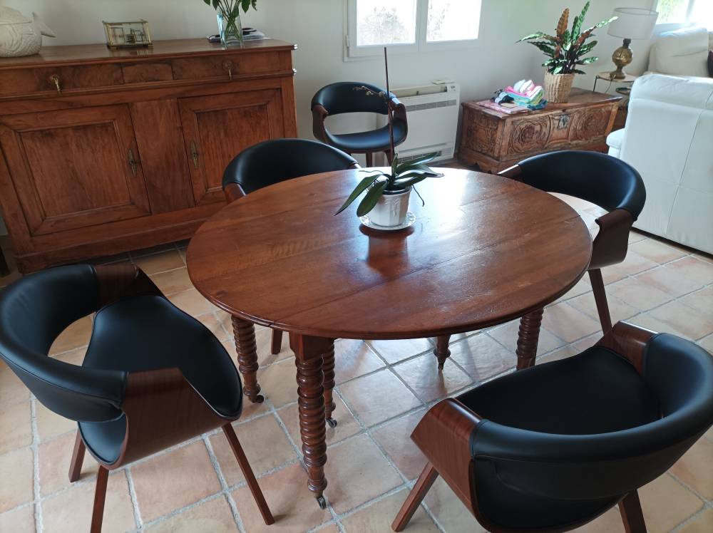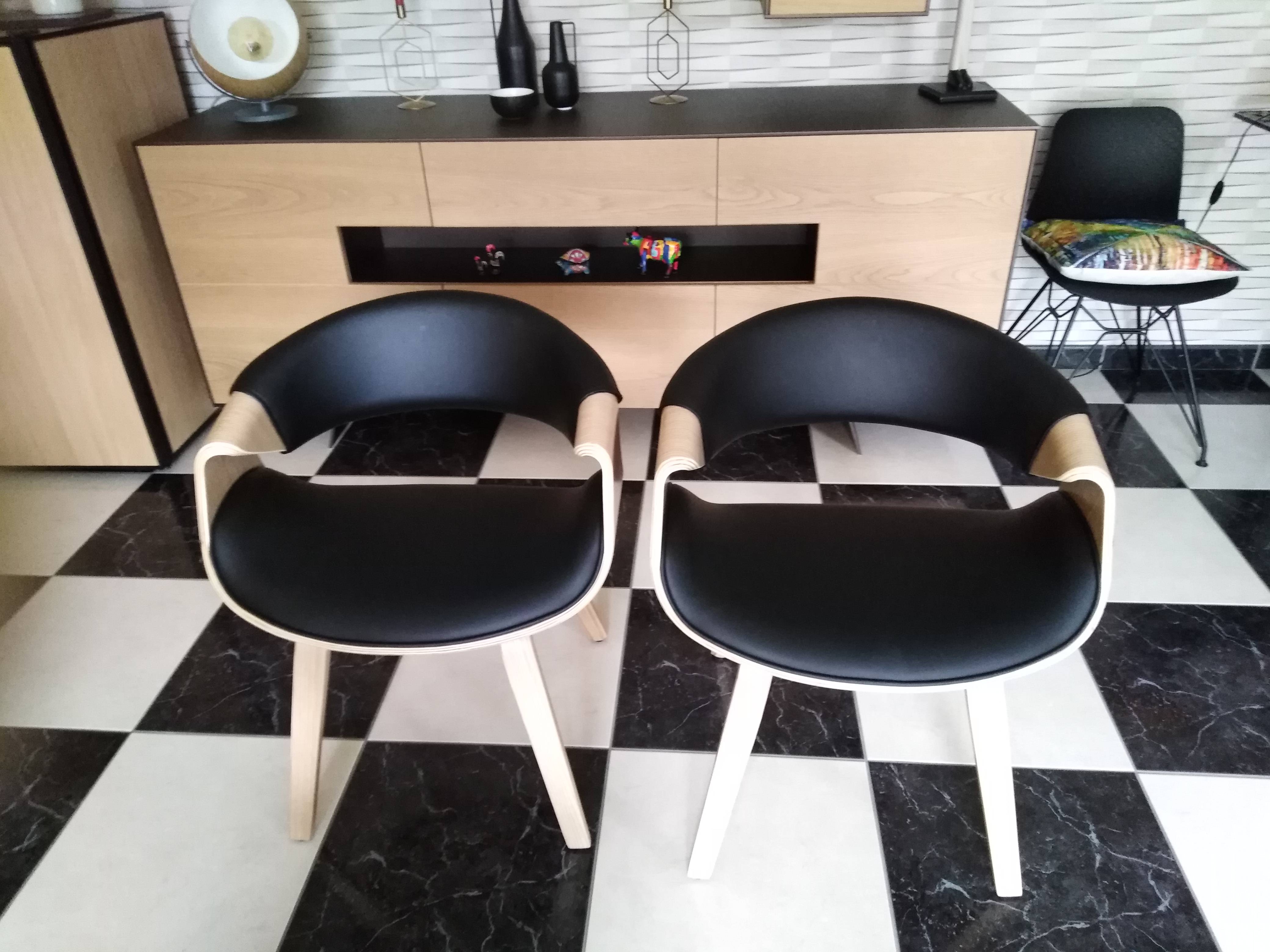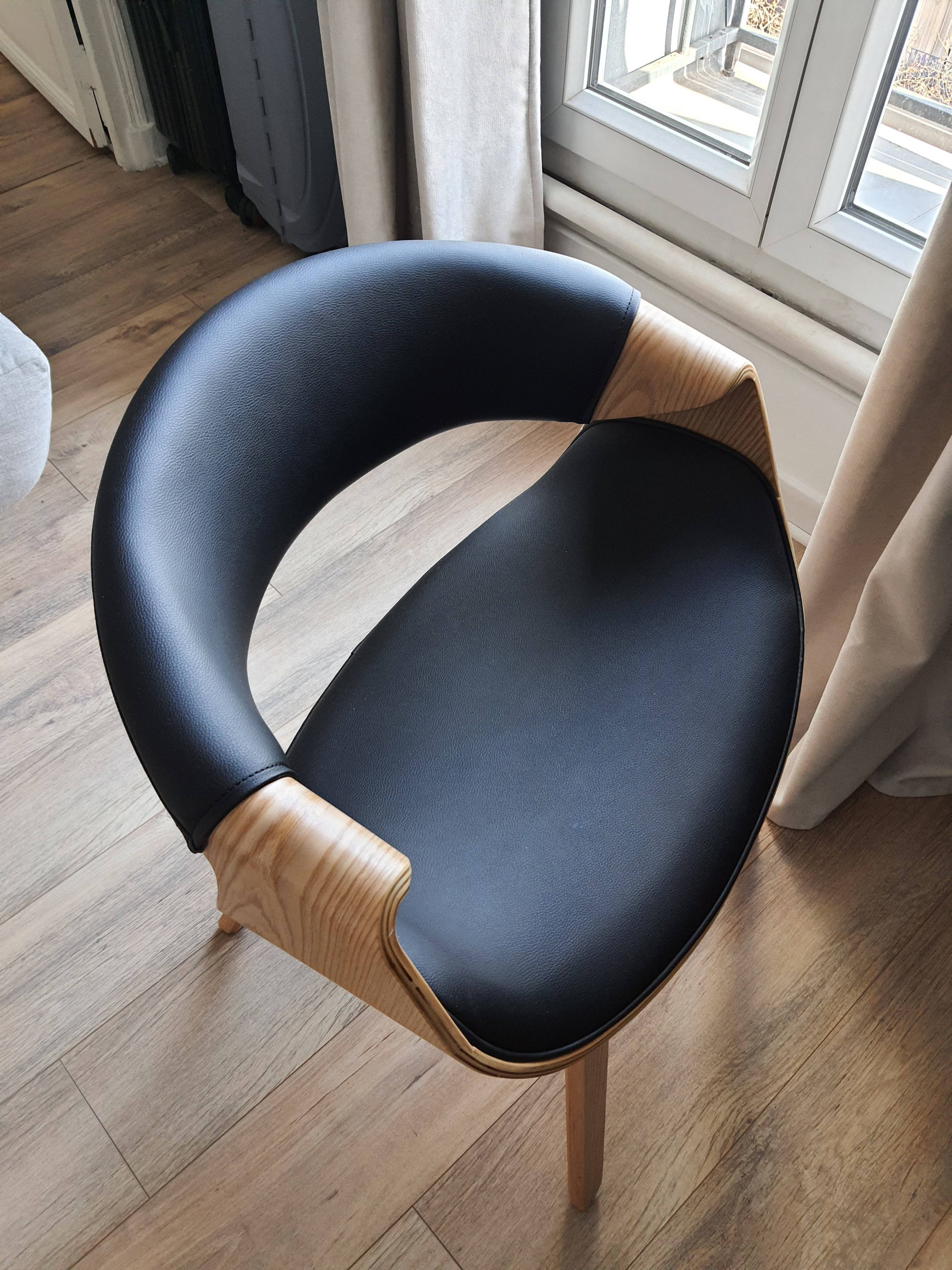Une chaise avec accoudoirs, au faux-airs de fauteuil moderne et cosy ! Assise et dossier sont rembourrés et recouverts de polyuréthane noir, une finition facile à entretenir, qui apporte une touche chic à l'ensemble. Le piètement plaqué bois foncé, épais et robuste est quant à lui un véritable gage de robustesse et de stabilité.