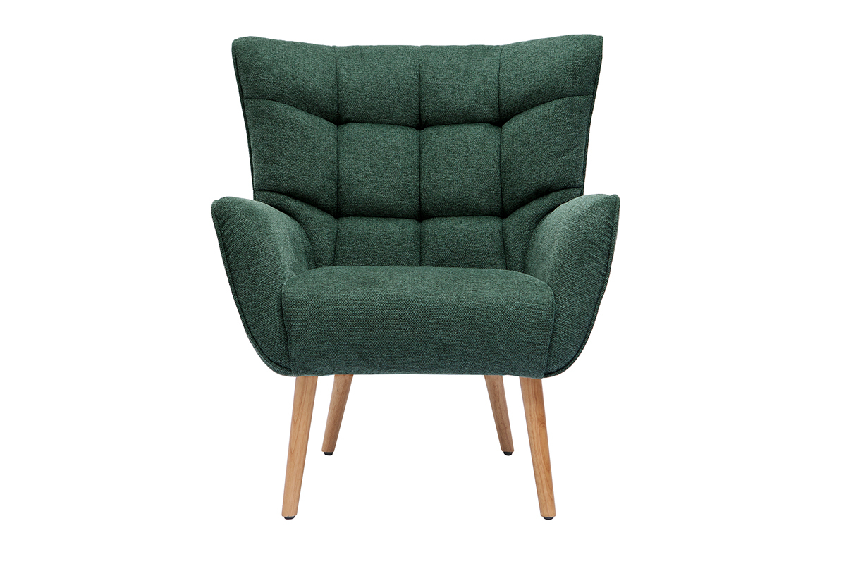 Le fauteuil AVERY semble vous inviter à la détente. C'est le dossier capitonné et le rembourrage de l'assise qui donnent cet effet unique. Ils ont été associés à une forme évasée et des dimensions généreuses pour un maximum de confort. Ce fauteuil réunit également des grands accoudoirs et un dossier haut, le parfait combo pour tous ceux qui aiment se lover dans leur fauteuil de salon. Le piètement en hévéa et le revêtement apportent une touche chaleureuse à l'ensemble. On aime particulièrement le tissu de ce modèle AVERY : son aspect effet velours texturé et son coloris vert foncé en font un siège unique.