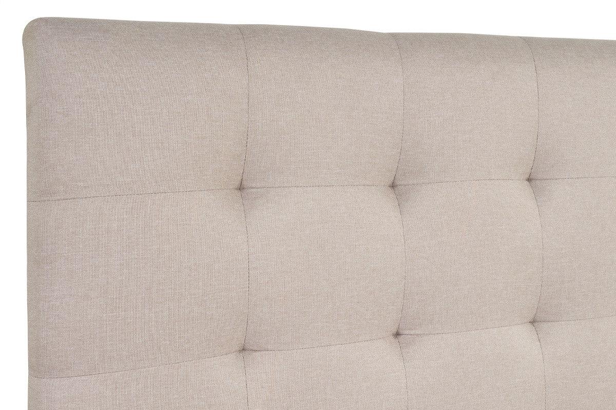Lit queen size en tissu beige, apprécié pour sa sobriété !