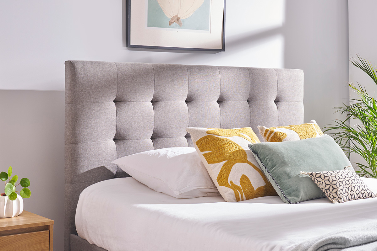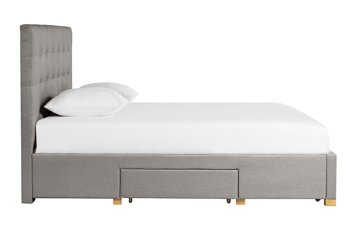 Lit queen size en tissu gris, apprécié pour sa sobriété !