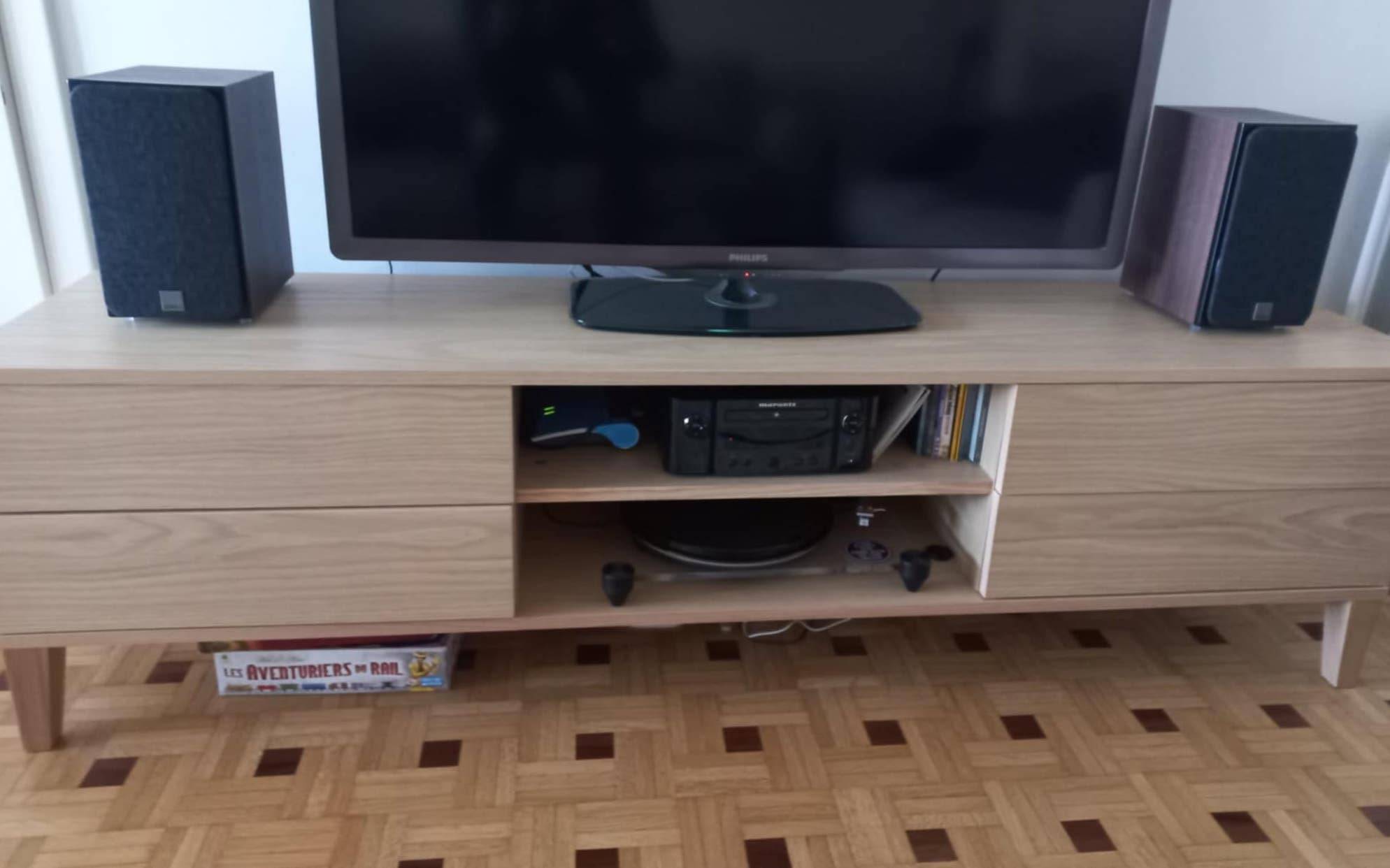Inspiré du mobilier en bois scandinave, ce grand meuble TV (L180 x P40 x H50 cm) s'intègre en douceur dans nos intérieurs. Son esthétique minimaliste met l'accent sur la fonctionnalité. Il est doté de 2 niches ouvertes avec passe-câbles qui accueilleront vos différents appareils électroniques (box, lecteur DVD ou console) sans risque de surchauffe et 4 grands tiroirs (dimensions intérieures : L51.5 x P28.5 x H10.5 cm) parfaits pour dissimuler tous les accessoires qui s'accumulent au fil du temps.