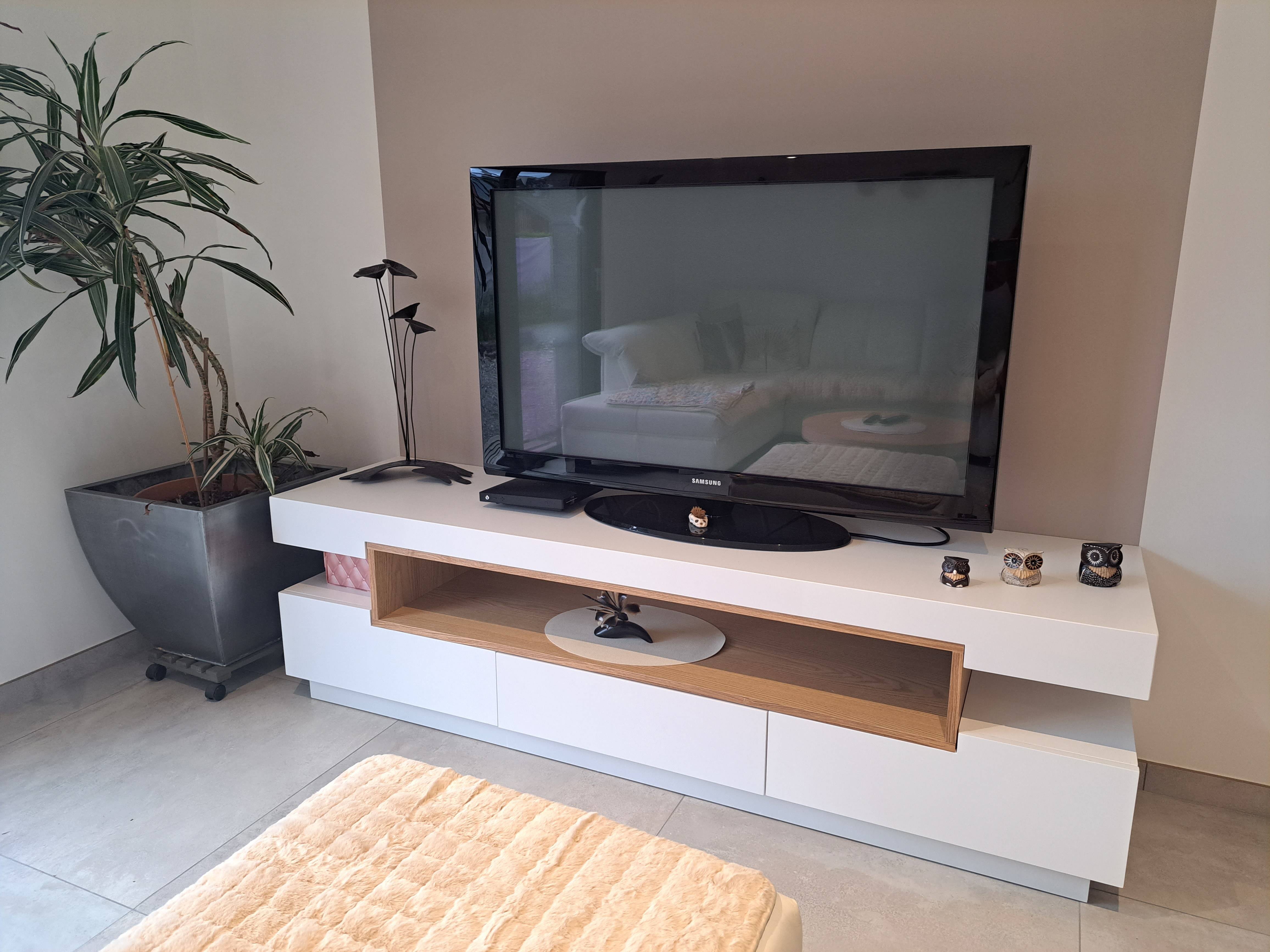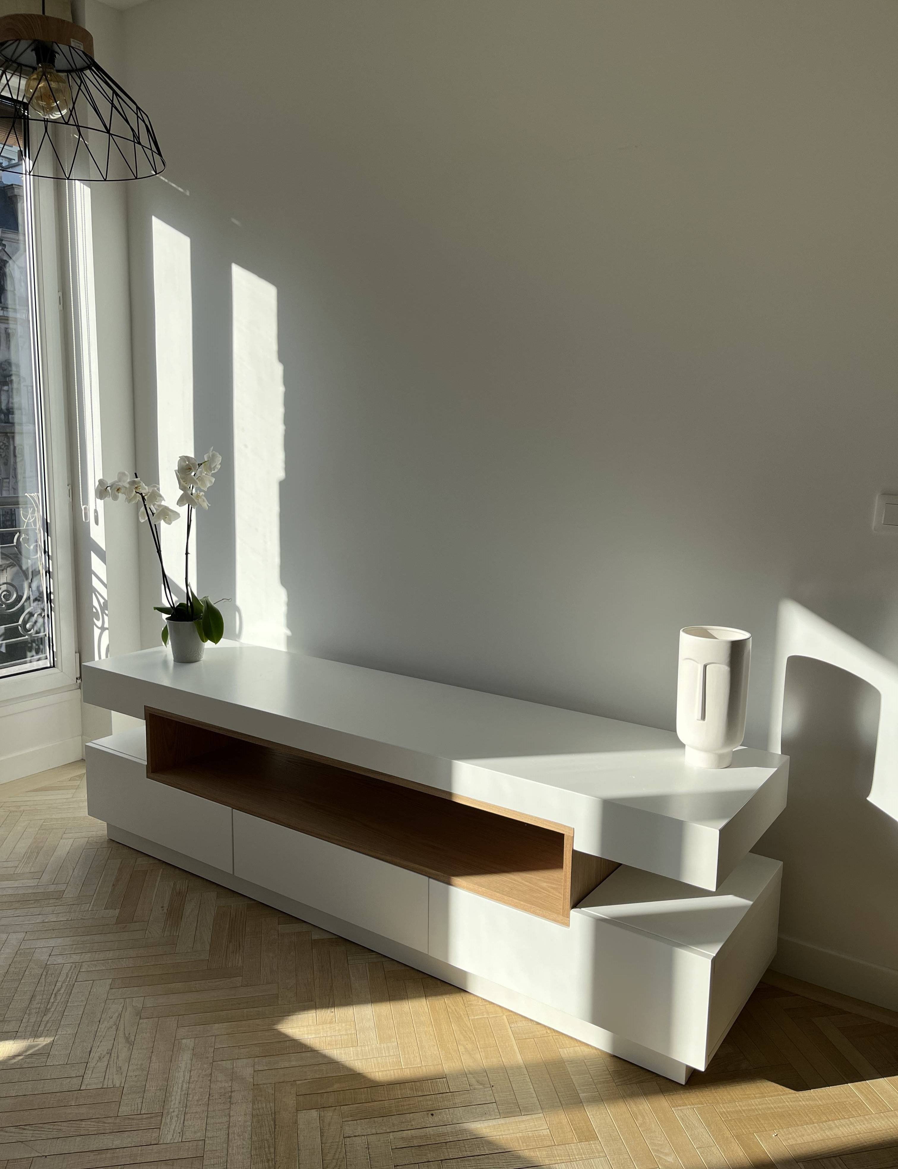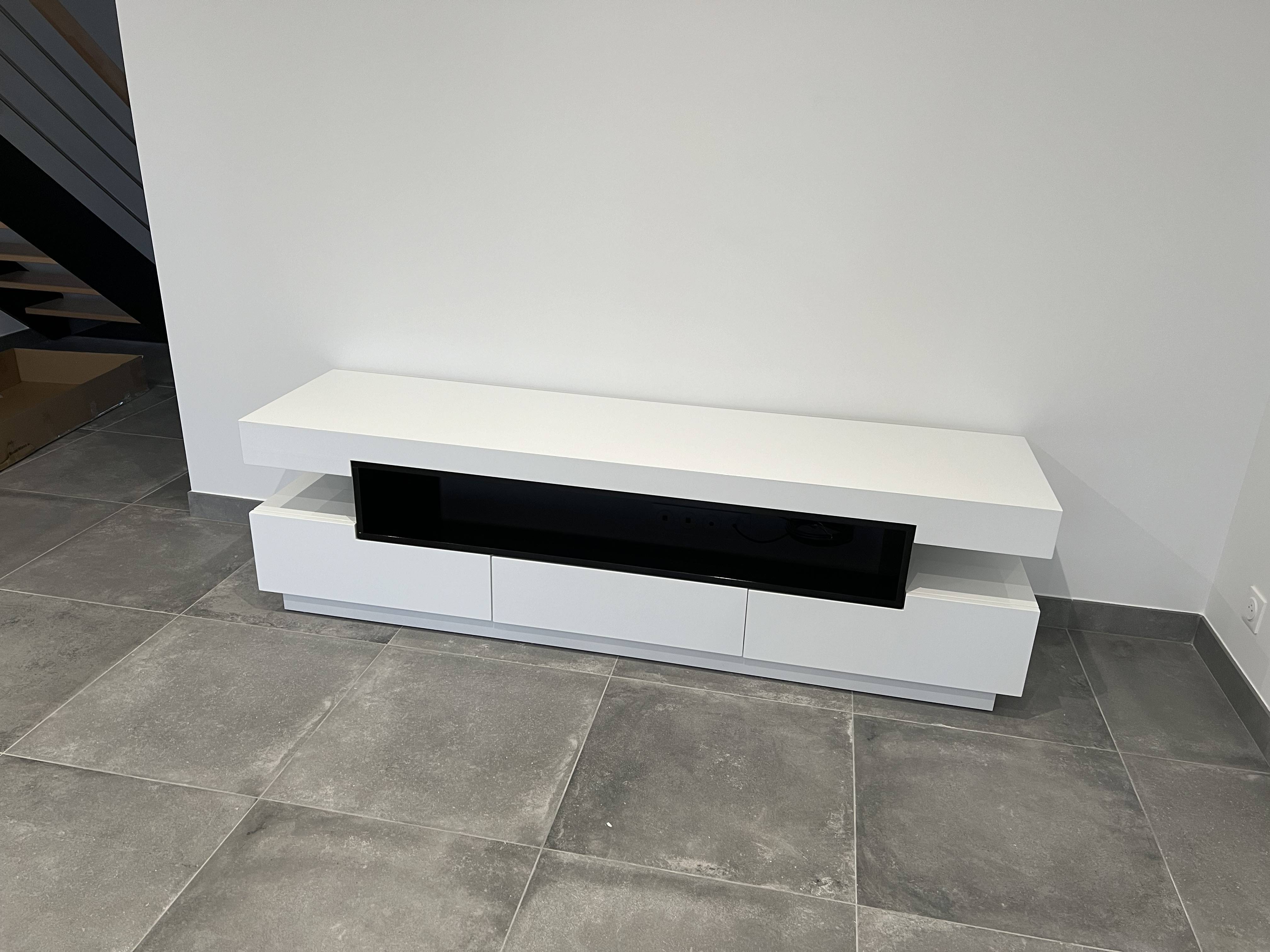 Sa ligne épurée, ses finitions de qualité en font un meuble TV design facile à vivre et simple d'entretien : en panneaux de fibres de bois laqué blanc sur la totalité de sa structure et noir (épaisseur 2 cm) très résistant, il nécessite tout au plus un chiffon doux légèrement humidifié pour retrouver toute sa superbe.