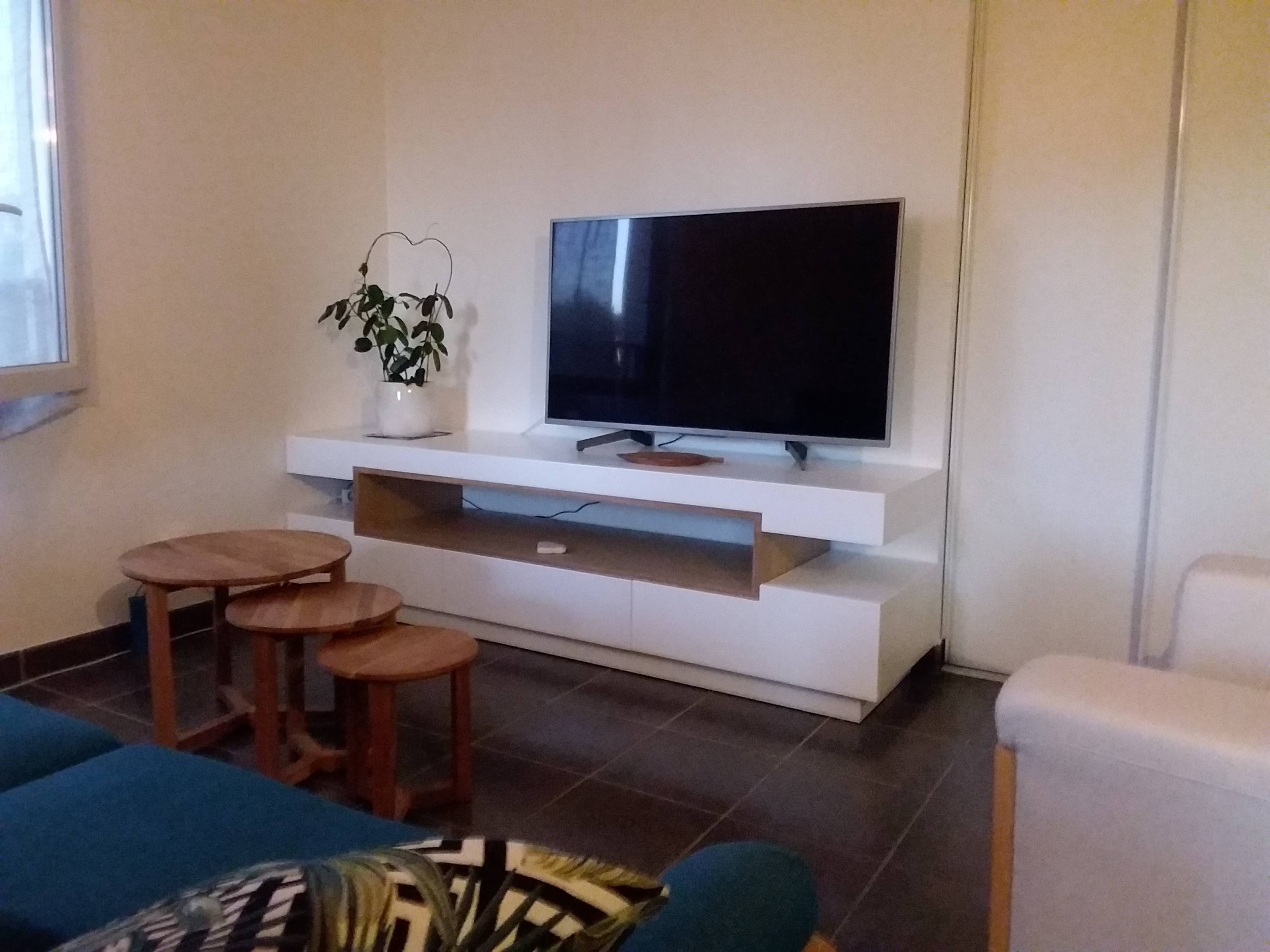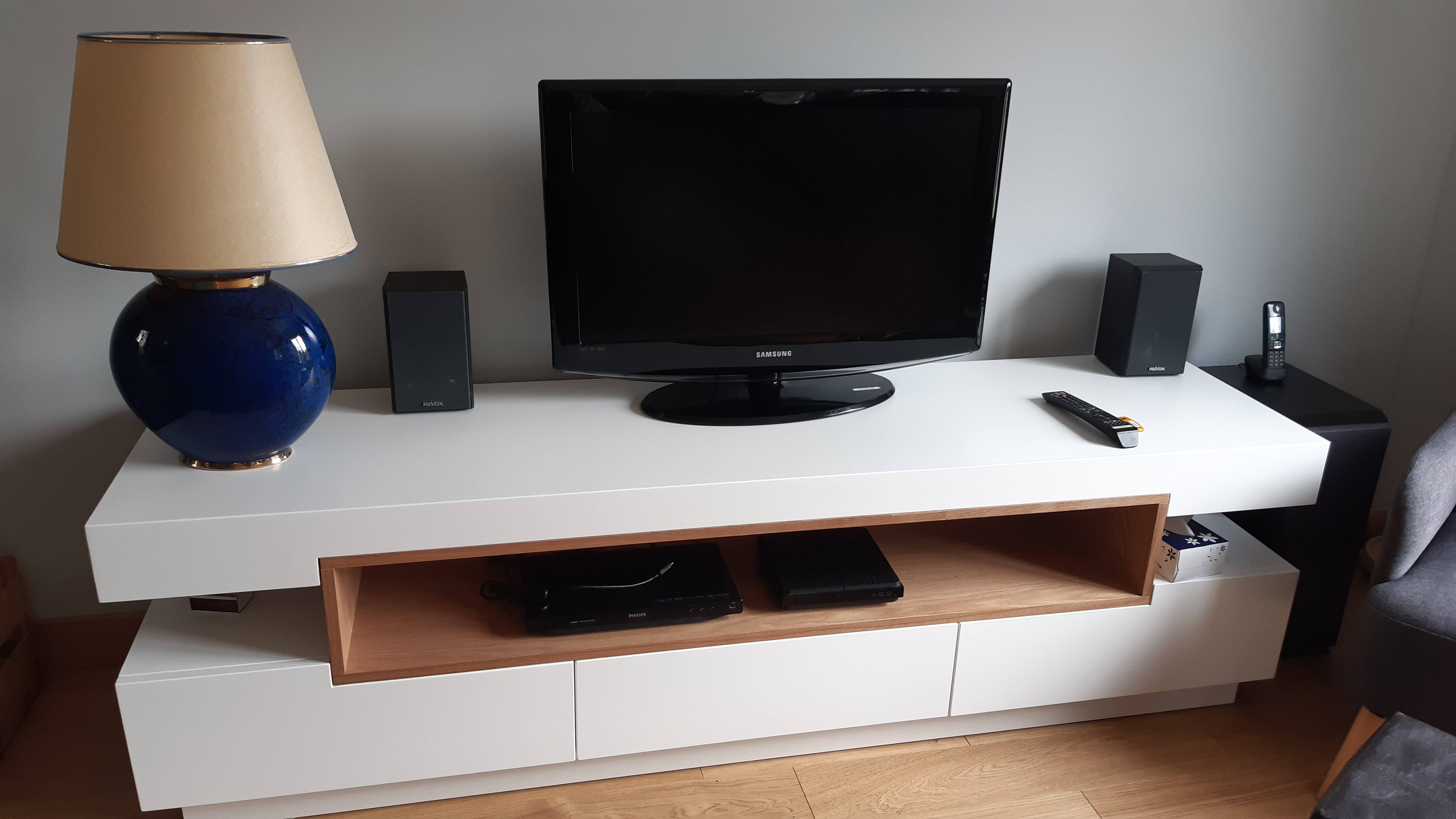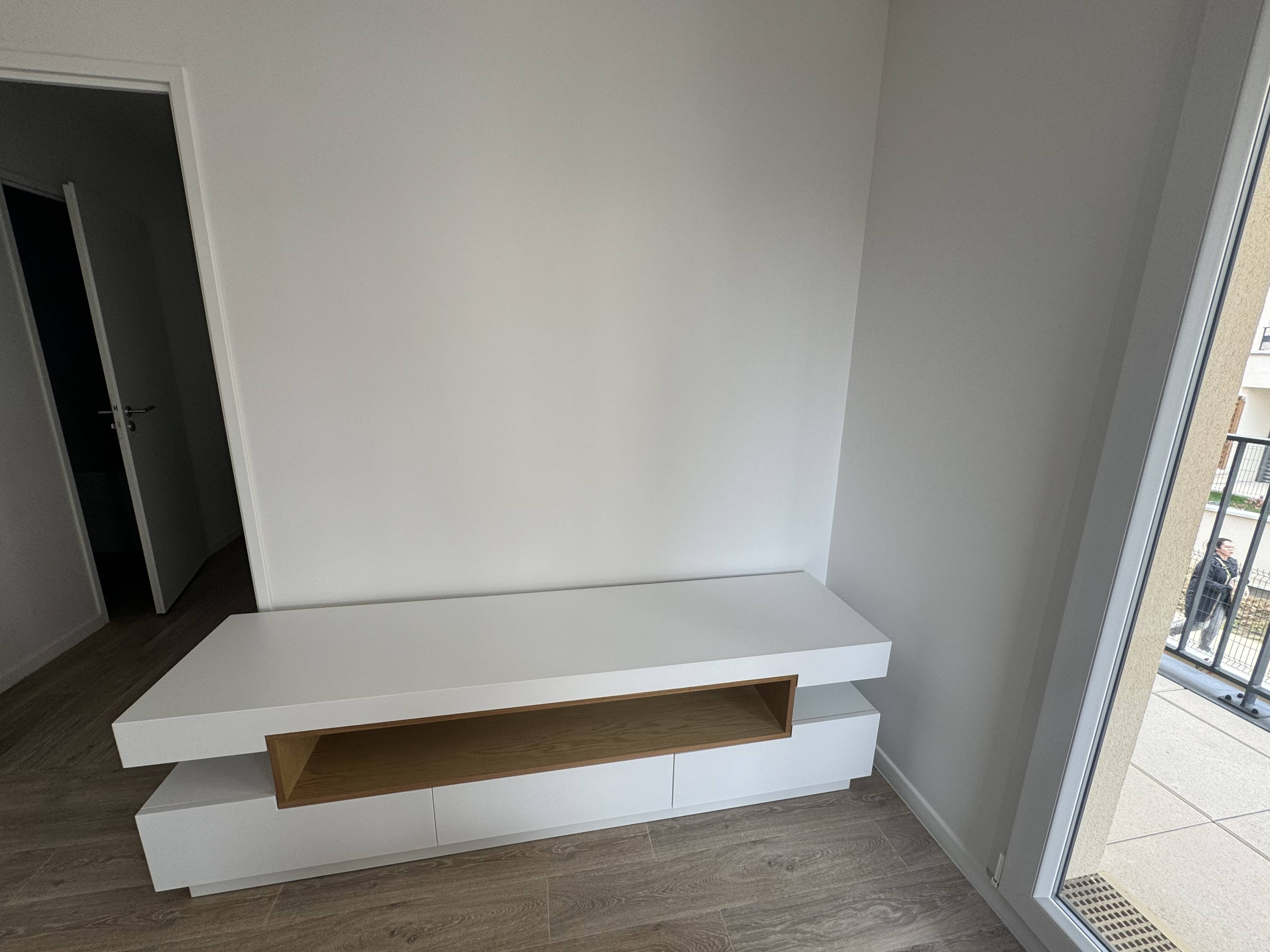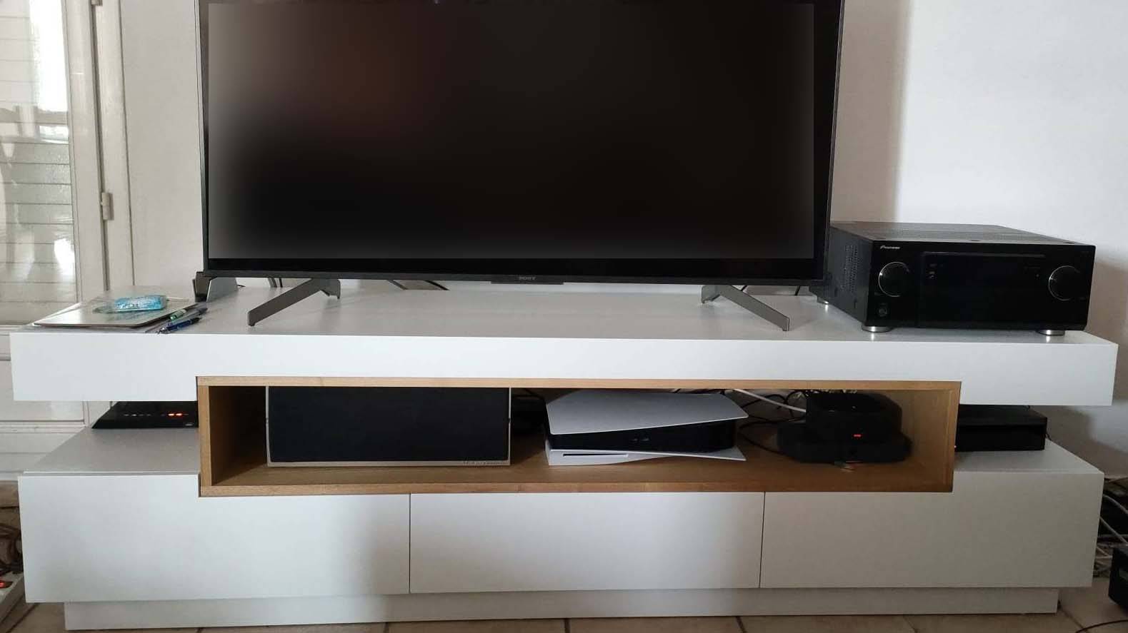 Sa ligne épurée, ses finitions de qualité en font un meuble TV design facile à vivre et simple d'entretien : en panneaux de fibres de bois laqué blanc sur la totalité de sa structure et noir (épaisseur 2 cm) très résistant, il nécessite tout au plus un chiffon doux légèrement humidifié pour retrouver toute sa superbe.