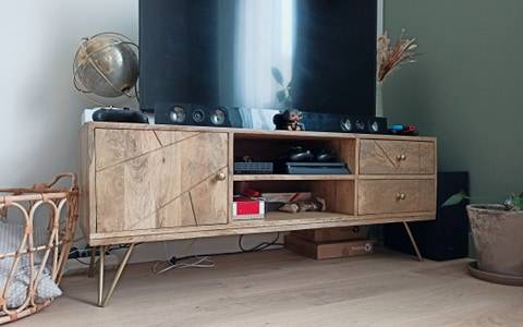 Les nombreux rangements du meuble TV en bois massif LINIUM permettent d'organiser le salon de façon optimale. Les deux niches centrales accueilleront le lecteur DVD ou le décodeur, le casier fermé et les deux tiroirs l'ensemble des affaires que l'on souhaite garder à portée de mains.