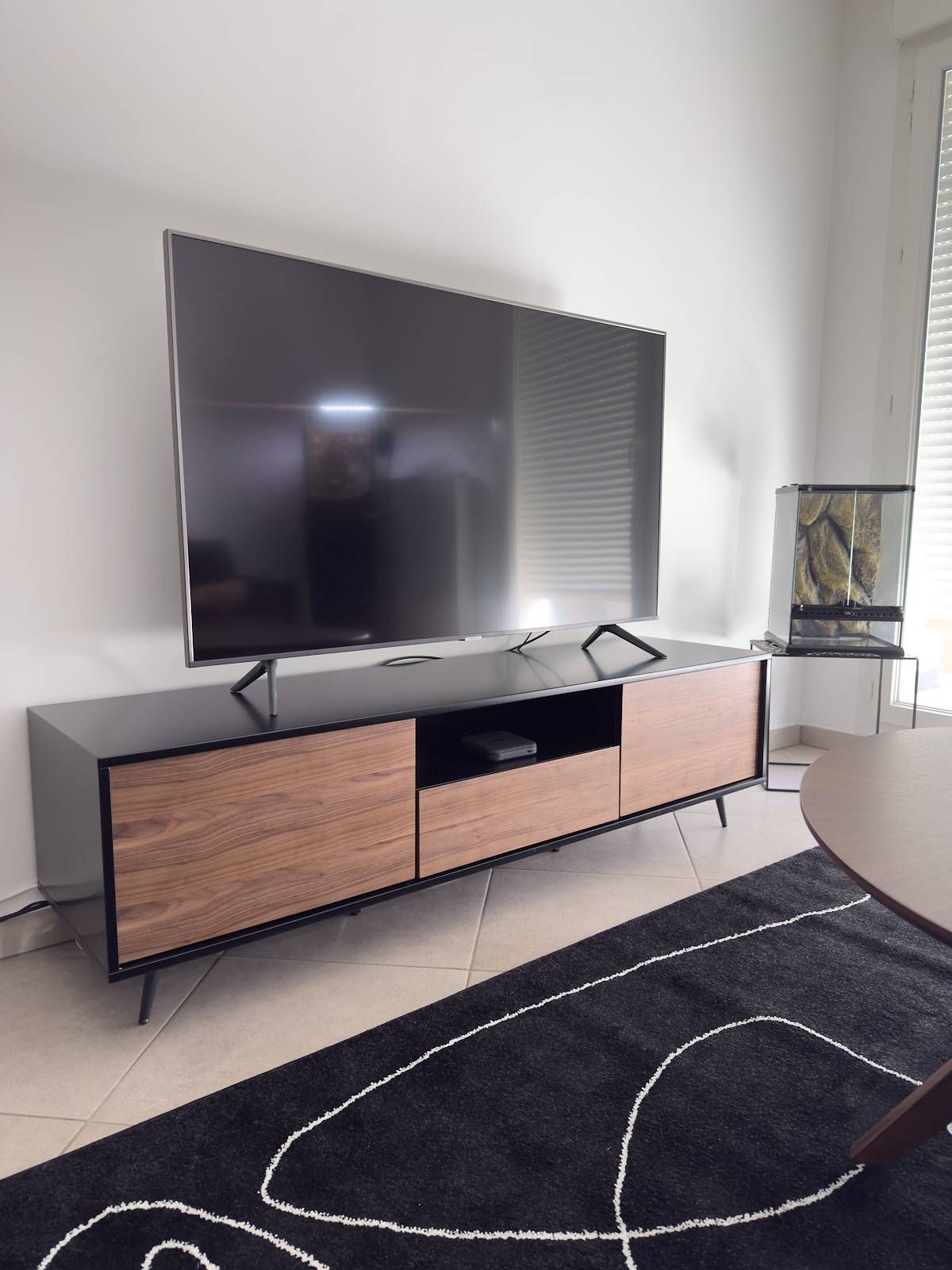 Mises en relief par un brun profond et nuancé, soulignées par le piètement compas en métal noir et les volumes minimalistes du caisson en panneaux de fibres de bois finition noir mat, les portes battantes plaquées noyer ne manquent pas d'apporter du cachet à ce meuble TV design. Prêts à envelopper de douceur un salon en quête d'élégance, bois foncé et noir forment une combinaison dont on ne fait plus l'éloge et offrent un résultat visuel des plus harmonieux. Inspiration vintage et lignes modernes se partagent la vedette d'une silhouette raffinée qu'on imagine prendre ses marques dans de nombreux styles d'intérieur.