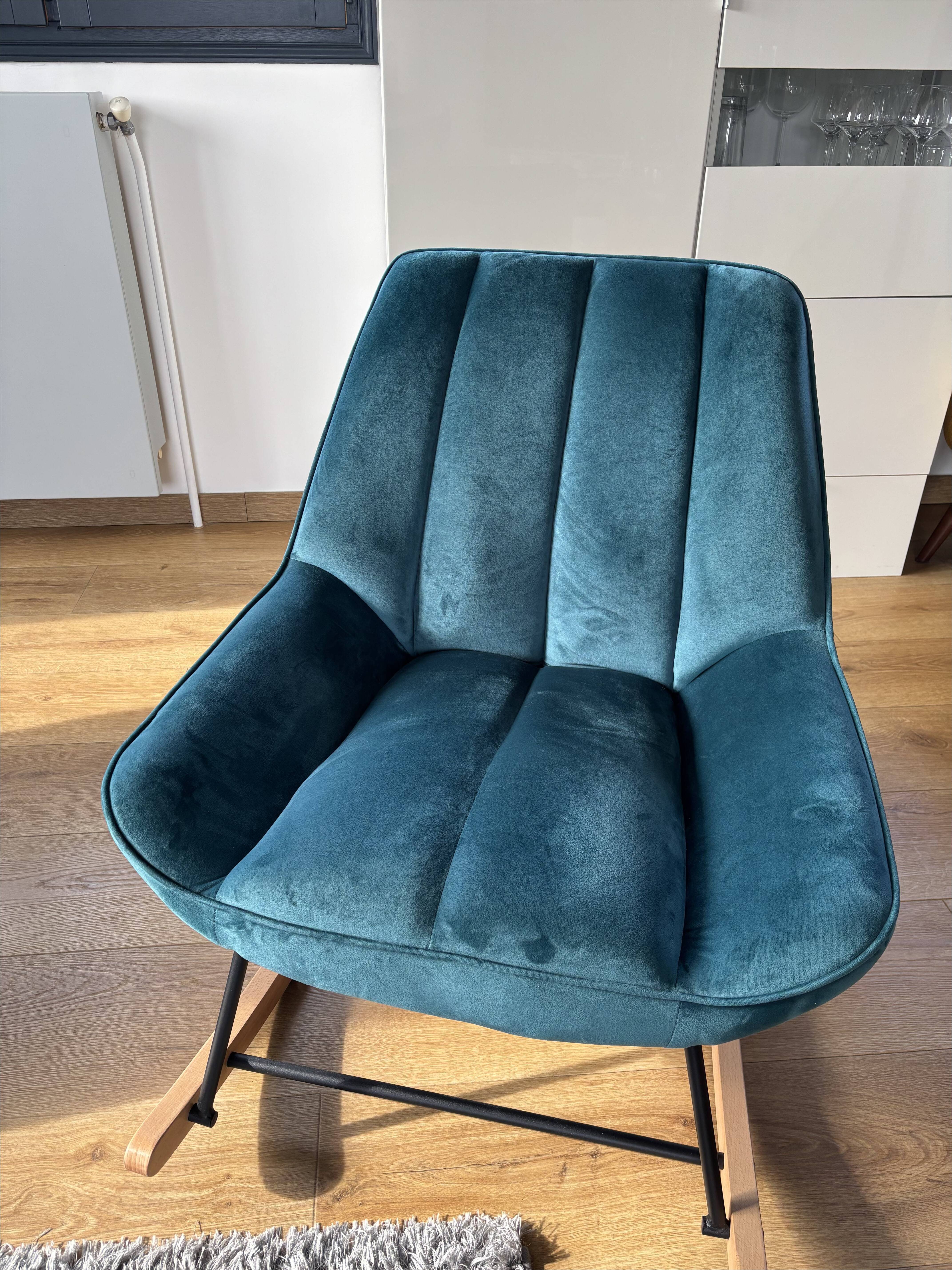Des lignes douces travaillées tout en courbes, un revêtement en tissu velours, un piètement bimatière chaleureux en bois massif et métal : tous les ingrédients sont réunis pour former un fauteuil à bascule confortable et cocooning. Ce jeu de matières et de textures donne à ce siège un style singulier qui fait son charme.