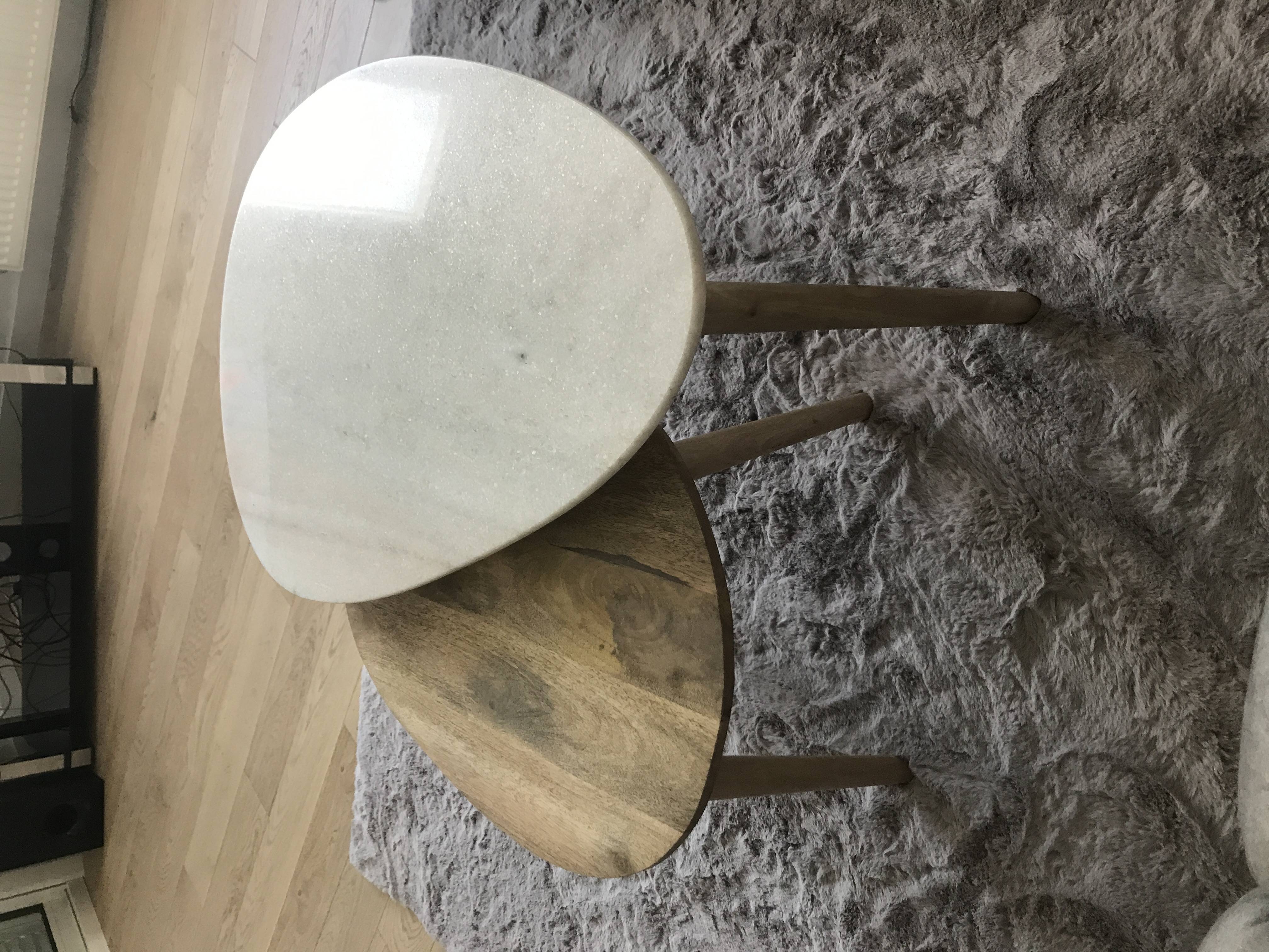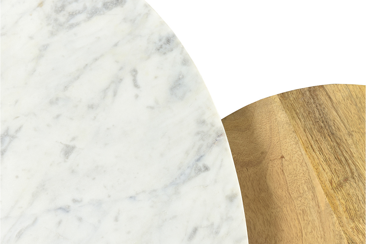 Ce lot de deux tables basses se démarque par ses formes organiques et son utilisation parfaite de deux matériaux nobles et tendance. Des lignes courbes ont été associées à des pieds compas en bois massif pour un esprit vintage revisité. Travaillés en marbre blanc et manguier massif, les deux plateaux forment un magnifique duo au style authentique et élégant. Avec ces tables basses, la noblesse du marbre retrouve le caractère du bois massif dans une composition parfaitement équilibrée.