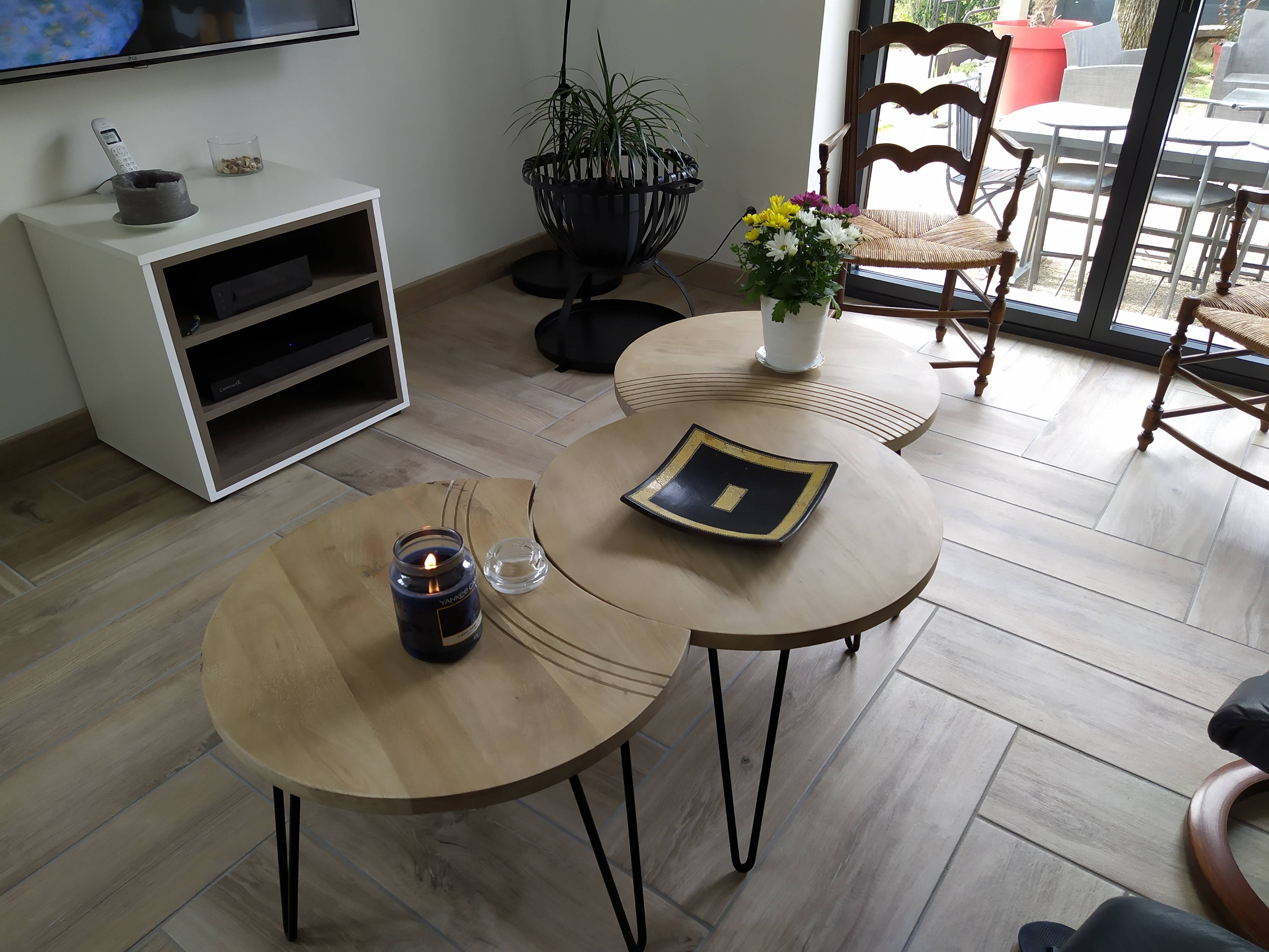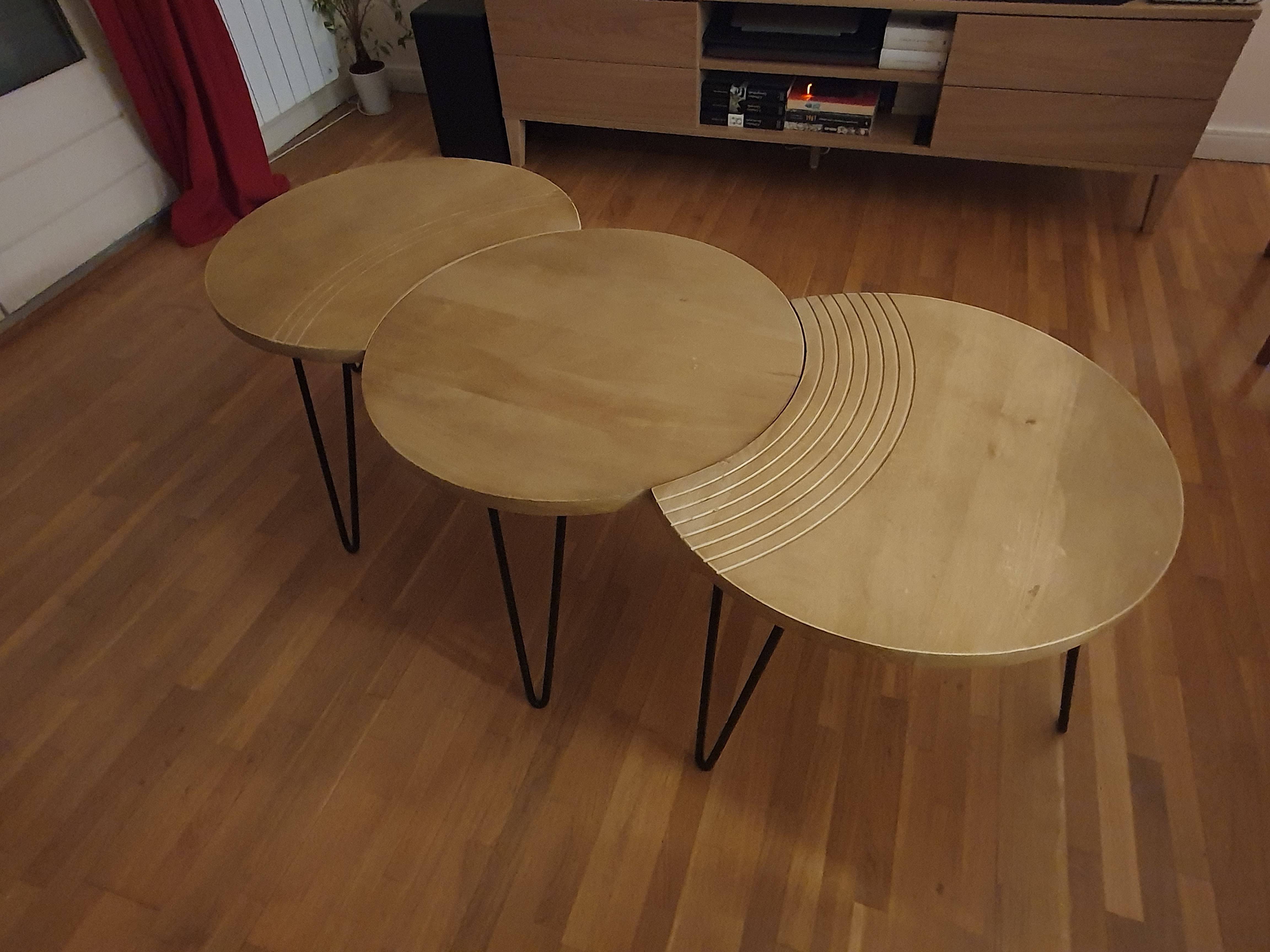 Deux des tables ont un côté incurvé, rappelant un croissant de lune, et sont gravées avec de jolis arcs de cercles pour souligner leur forme. La troisième table est totalement ronde et dispose d'un diamètre de 60 cm. Composez votre espace salon au gré de vos envies en associant les 3 tables, ou seulement deux pour en placer une en table d'appoint dans un coin de la pièce. Tout est possible et le rendu sera au rendez-vous.