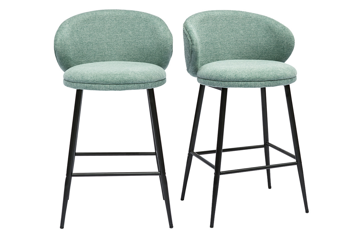 Les tabourets de bar design sont recouverts d'un tissu effet velours texturé céladon (95% polyester, 5% nylon) doux au toucher. L'élégant passepoil qui dessine les contours du dossier parfait l'ensemble.